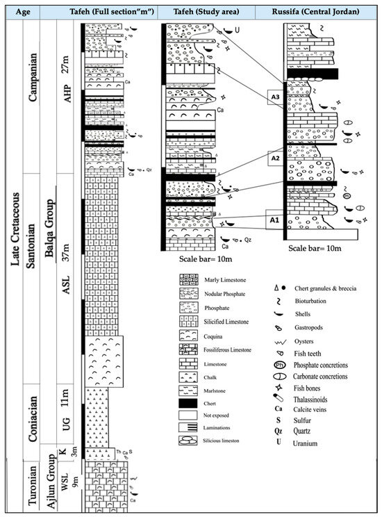 Vertical columnar sections of the studied outcrops at Al-Tafeh and Russifa areas.