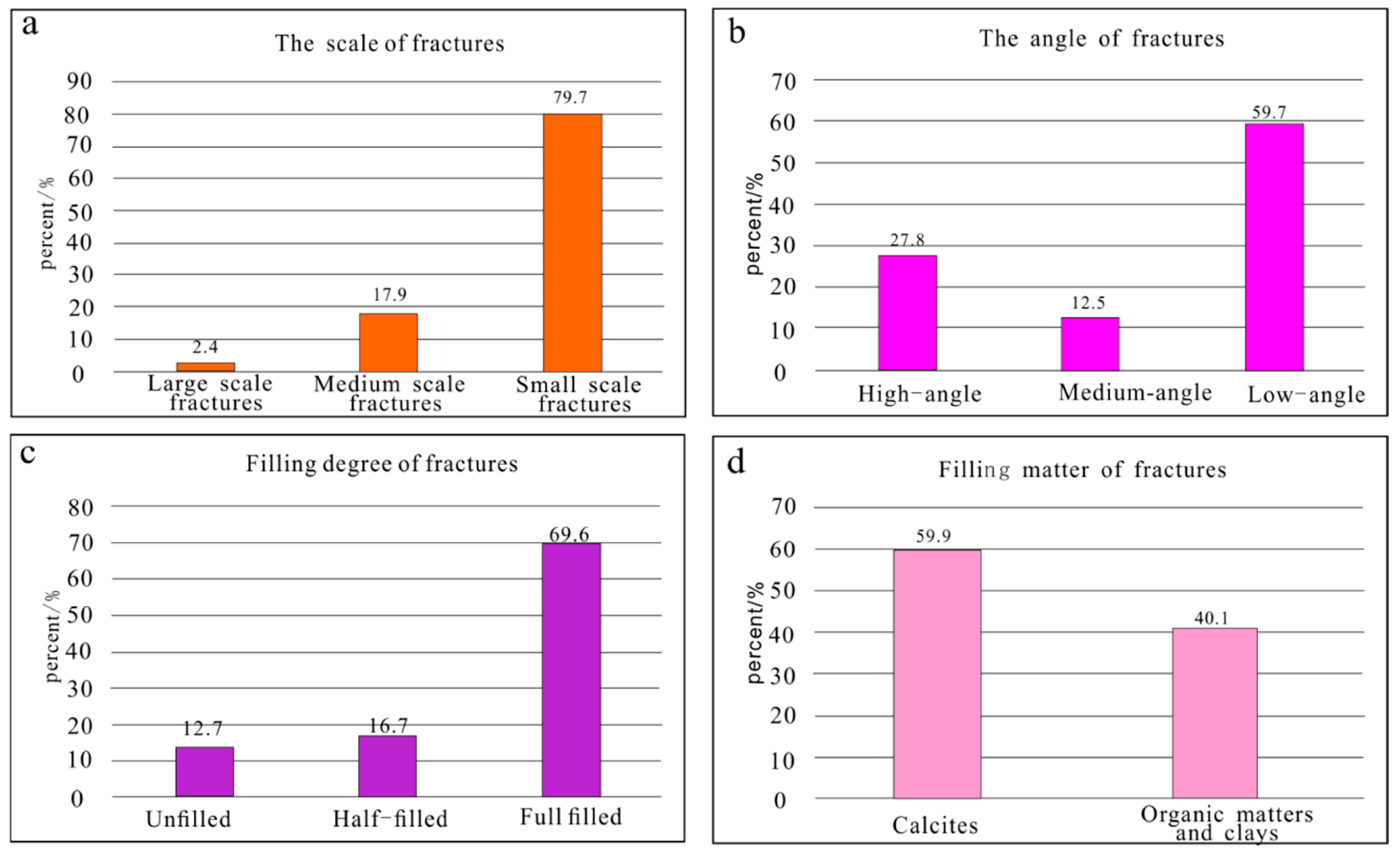 Fracture information statistics from the cores (N = 768). (a) The size classes of fractures. (b) The dip-angle classes. (c) The degree of filling. (d) The fill materials.