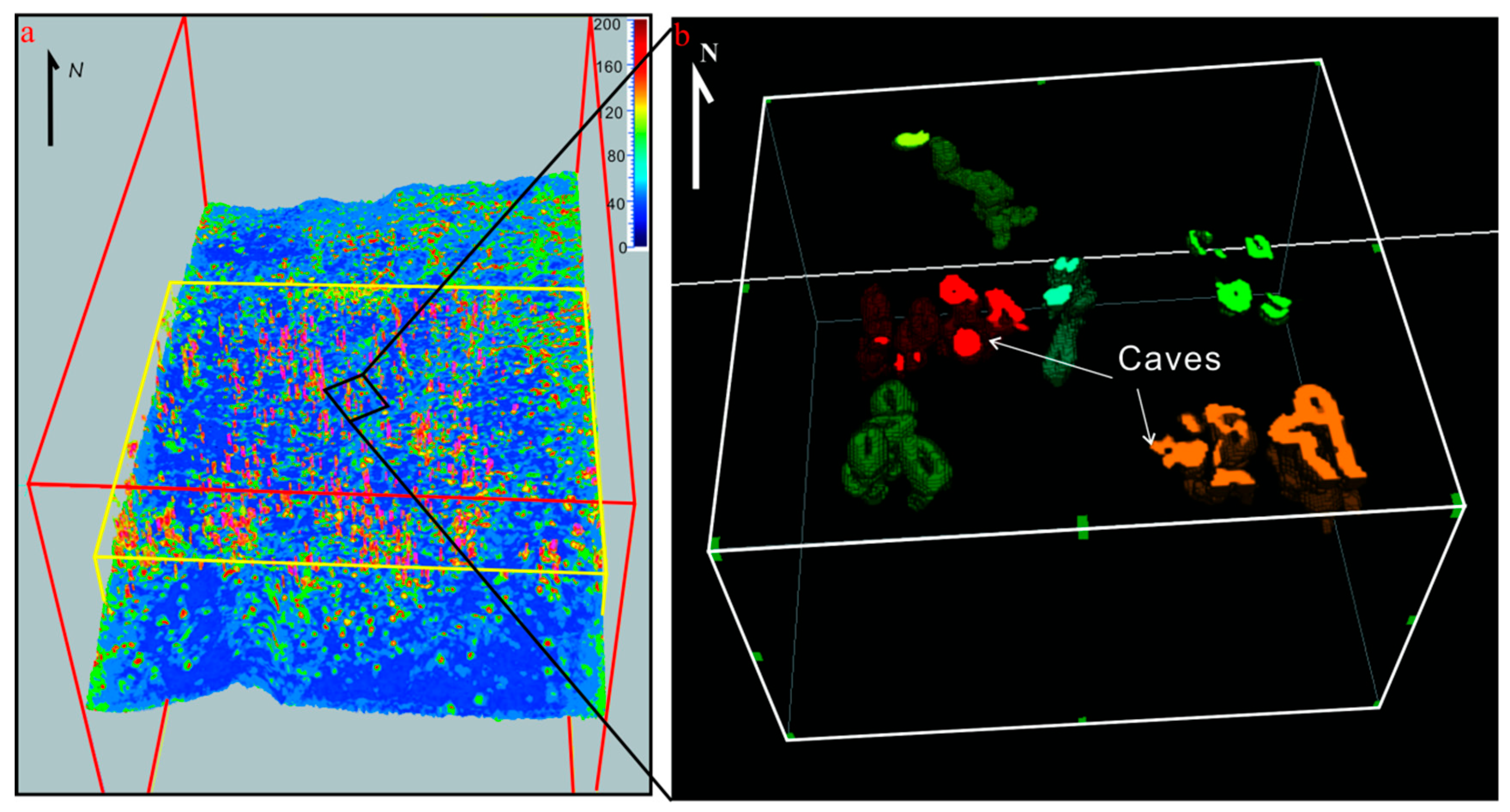 Derived from a 3D seismic dataset, this is a 3D topographic map of the caves located in the study area. (a) The amplitude change rate showing of fracture cavity. (b) Carving of cave bodies using SVI software.