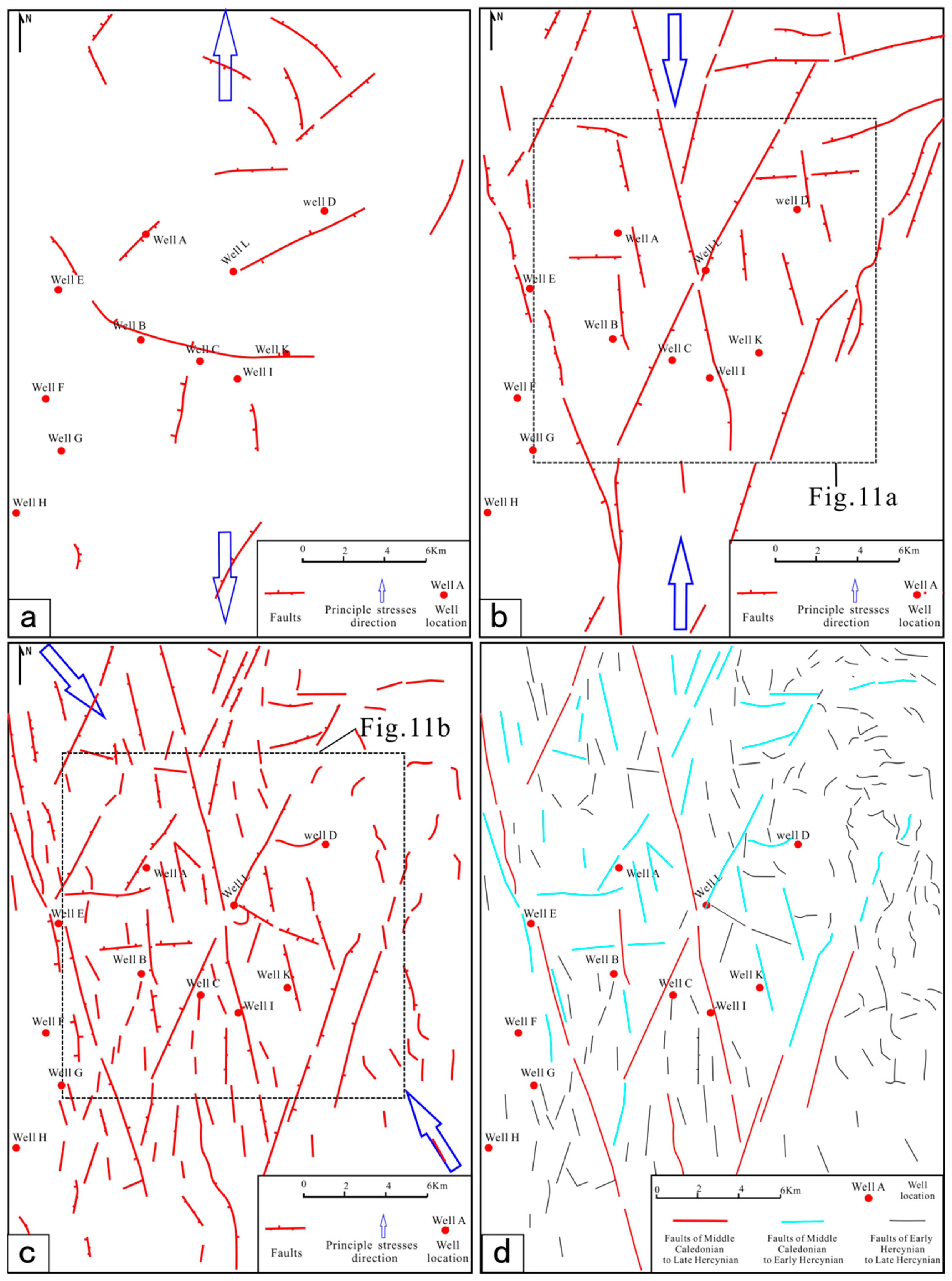 Distribution of the fault system in different stages. (a) Faults formed in the Early Caledonian period. (b) Faults formed in the Middle Caledonian period. (c) Faults formed in the Early Hercynian period. (d) Characteristics of inherited faults.