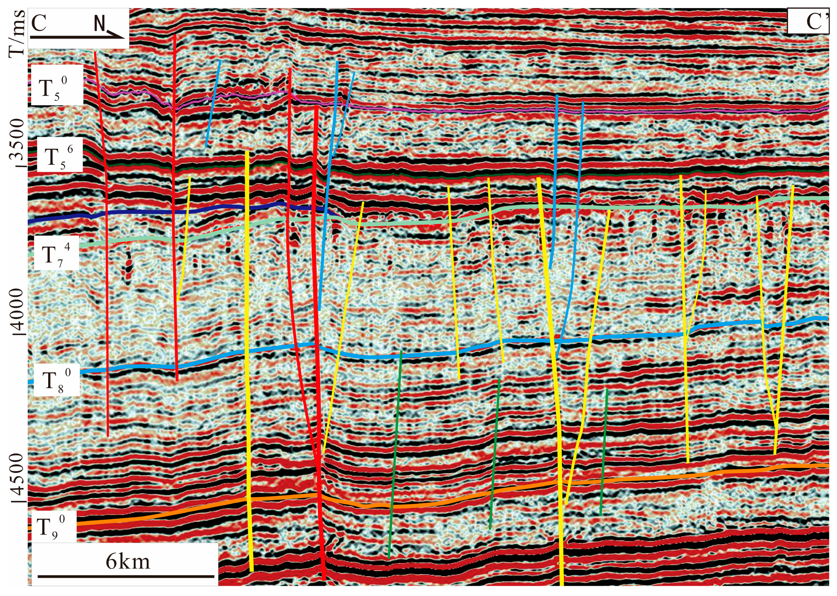 Across the study area, seismic profiles provide visualizations of Paleozoic faults along with stratigraphic interpretations. See Figure 1, C–C’ for location. Faults are in their color definitions: Early Caledonian in green, Early/Middle Caledonian–Early Hercynian in yellow, Early/Middle Caledonian–Late Hercynian in red, Early Hercynian, and Late Hercynian in navy.