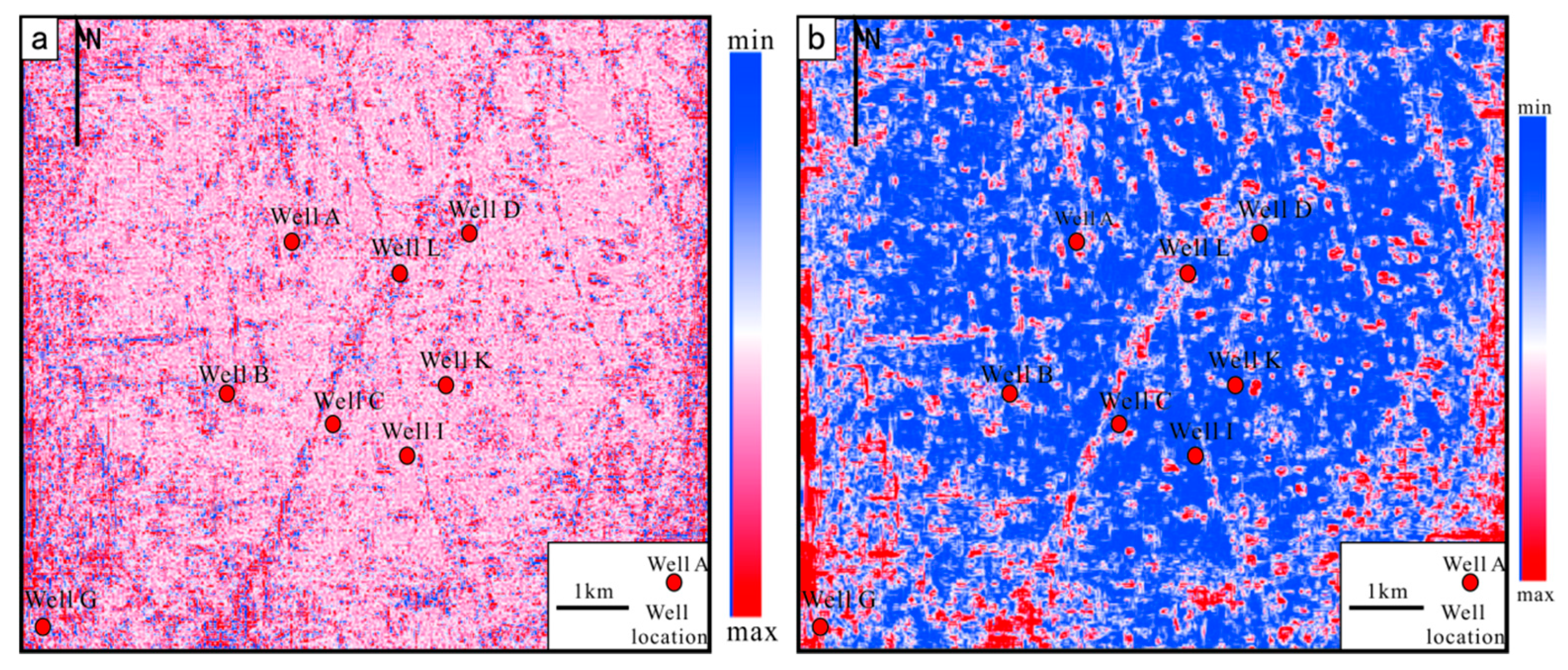 The curvature attributes of different layer showing different stage faults. (a) Faults originating in the Middle Caledonian period. (b) Faults originating in the Early Hercynian period.