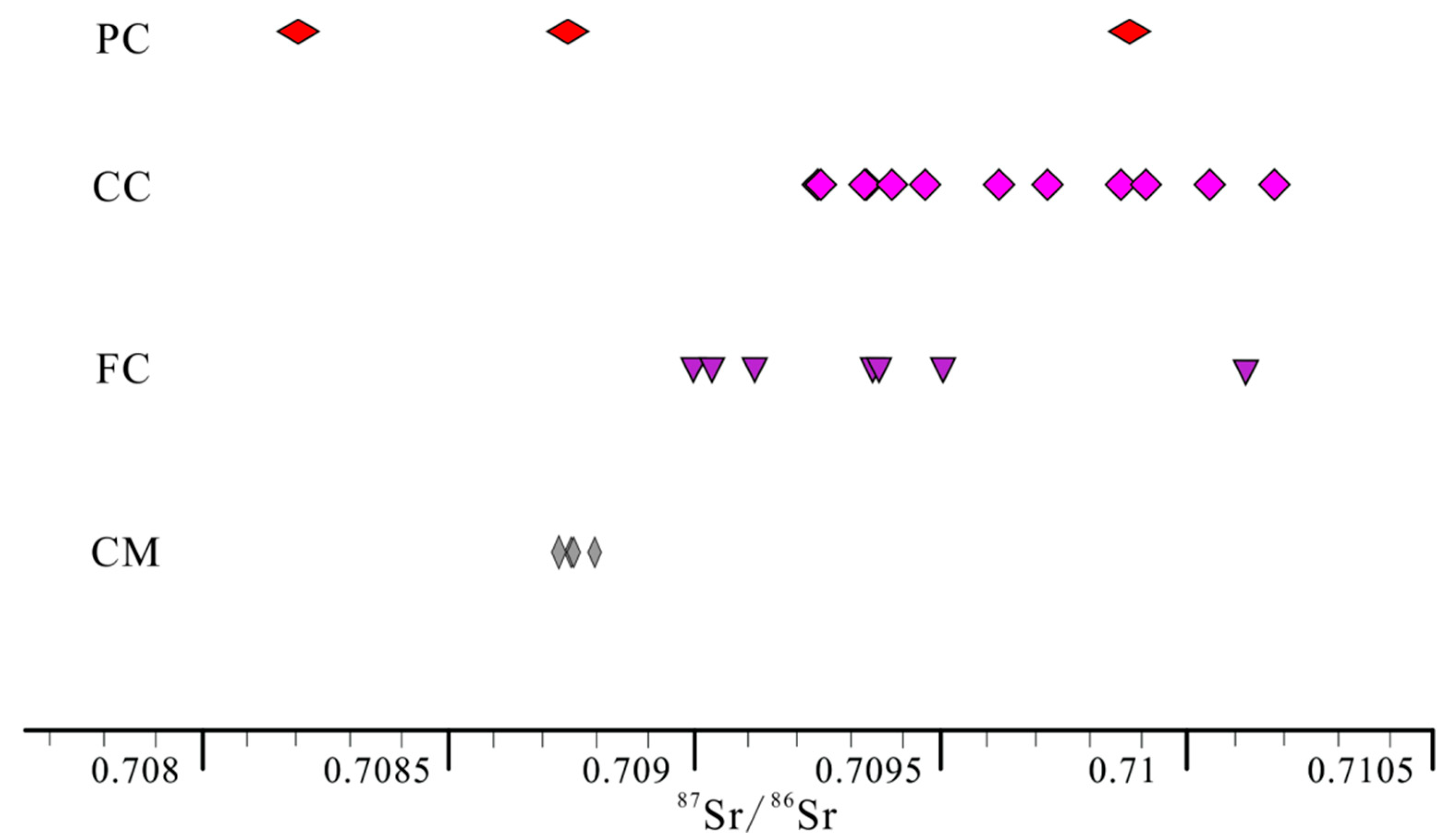 For the CM samples from the Middle-Lower Ordovician, the 87Sr/86Sr ratios range from 0.708741 to 0.708813, with an average of 0.708770 (Table 1). Most of these ratios in the study area fall within the range of Ordovician marine carbonates as defined by Denison [50]. The PC samples have 87Sr/86Sr ratios spanning 0.708176 to 0.709883 (average of 0.708927); excluding one sample with an exceptionally high value (0.709883), their ratio range is consistent with that of the CM samples. The 87Sr/86Sr ratios of FC and CC samples are 0.709221–0.710177 (average of 0.709601) and 0.709–0.71012 (average of 0.709359), respectively (Figure 12). High 87Sr/86Sr ratios suggest the input of external sources and other fluids rich in 87Sr, such as crust-derived Sr from meteoric freshwater. Additionally, deep intermediate-acid volcanic rocks can also contribute to the increase in 87Sr/86Sr ratios [14,23,51].