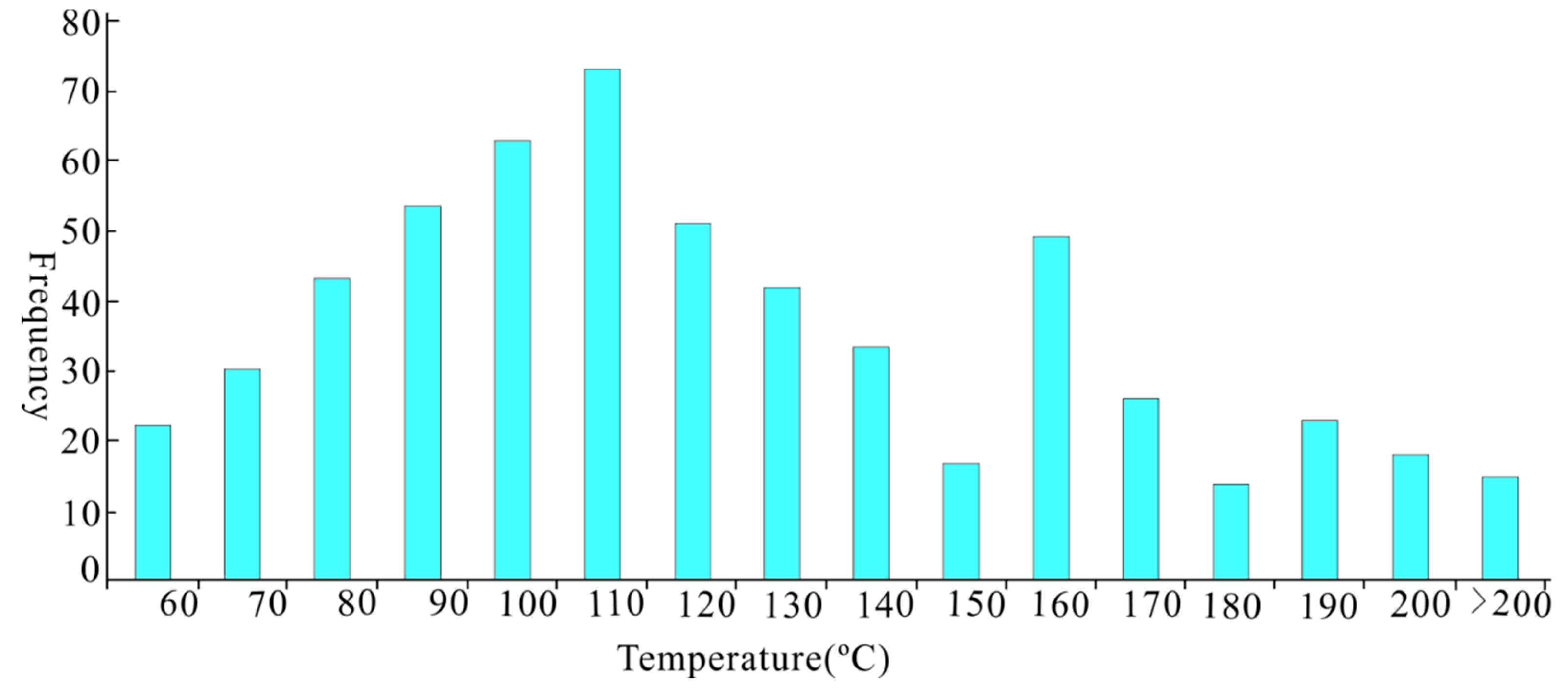 The formation, development, and evolution of fluids occur alongside the evolution of petroliferous structural basins. The Ordovician reservoir in the Tahe Oilfield is a marine carbonate deposit that has undergone a long-term structural evolution process, enduring multiple tectonic movements and structural deformations. Fluid inclusions in calcite veins from different parts of the Ordovician carbonate strata preserve thermodynamic information—such as temperature and pressure—from various stages throughout the tectonic history. Figure 13 shows the characteristics of homogenization temperatures of fluid inclusions in carbonates in the southern Tahe Oilfield. These homogenization temperatures range from 43.2 °C to 261.3 °C and are divided into three groups according to their distribution: <60–140 °C, 140–170 °C, and 170 °C to over 200 °C.