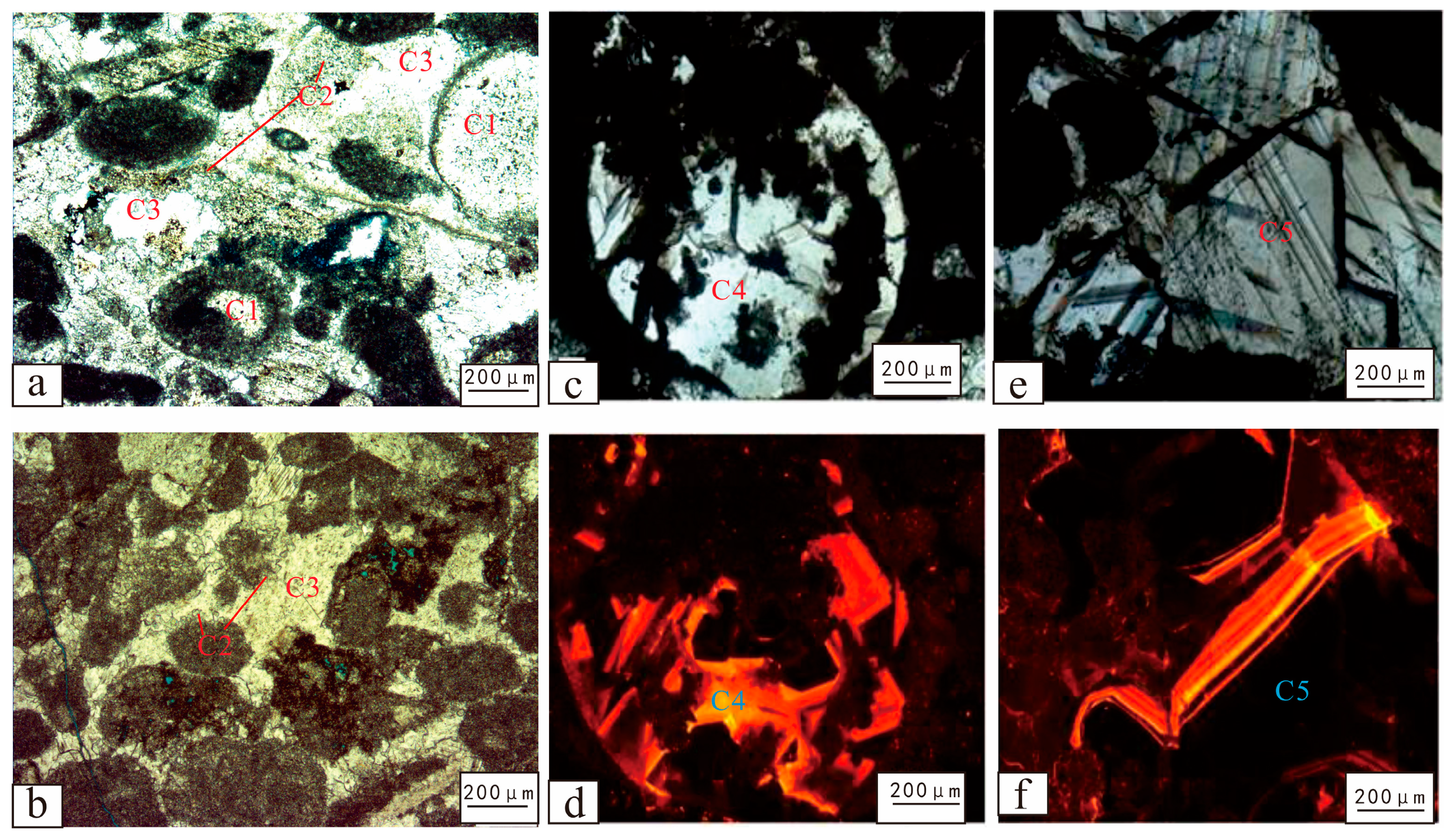 - Han, C.C.; Lin, C.Y.; Lu, X.B.; Tian, J.J.; Ren, L.H.; Ma, C.F. Petrological and geochemical constraints on fluid types and formation mechanisms of the Ordovician carbonate reservoirs in Tahe Oilfield, Tarim Basin, NW China. J. Pet. Sci. Eng. 2019, 178, 106–120. [Google Scholar] [CrossRef]