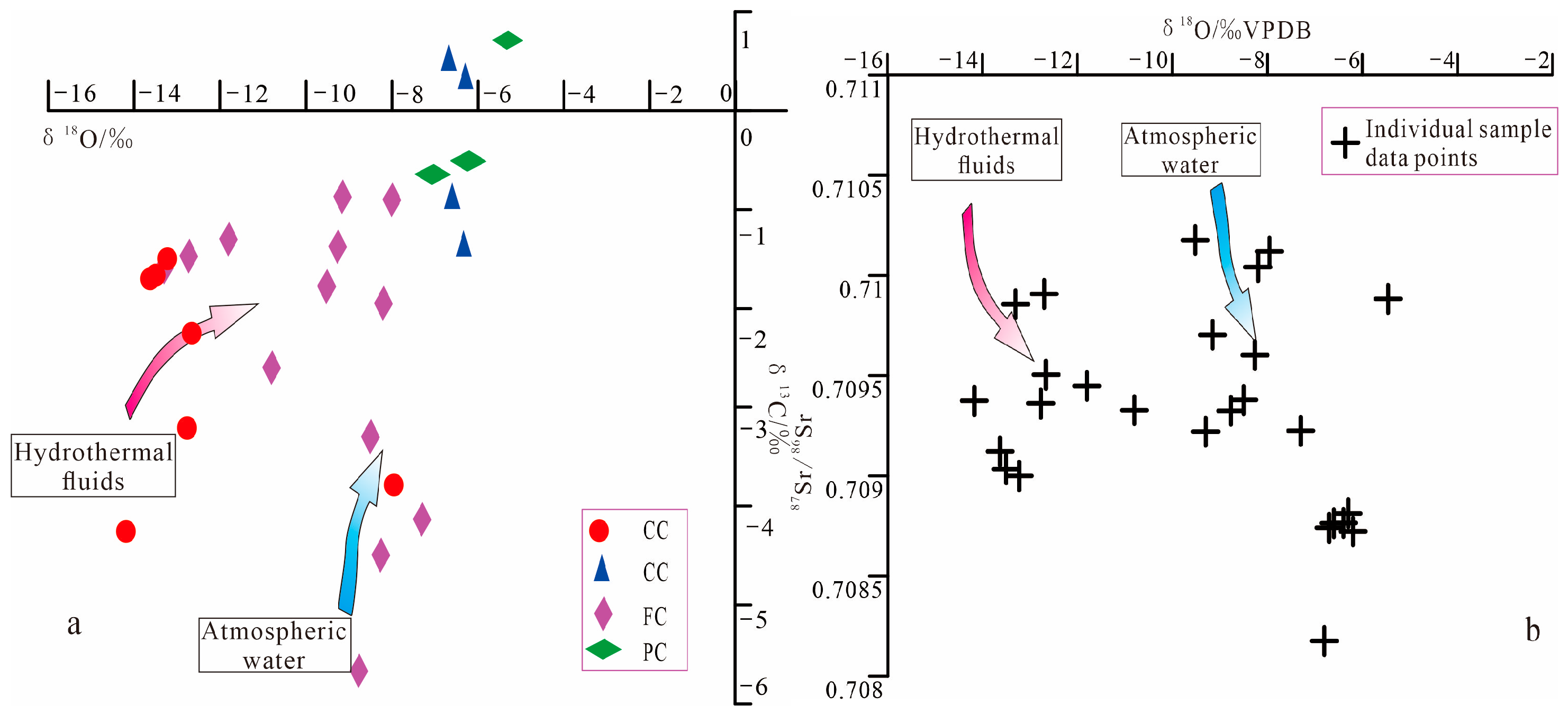 For the FC samples, the δ13C values range from −4.67‰ to −0.87‰ VPDB (with an average of −2.47‰ VPDB), and the δ18O values span from −13.3‰ to −7.3‰ VPDB (averaging −9.8‰ VPDB). As for the PC samples, their δ13C values vary between −0.9‰ and 0.72‰ VPDB (average of −6.15‰ VPDB), while their δ18O values range from −6.8‰ to −5.46‰ VPDB (average of −13.08‰ VPDB).