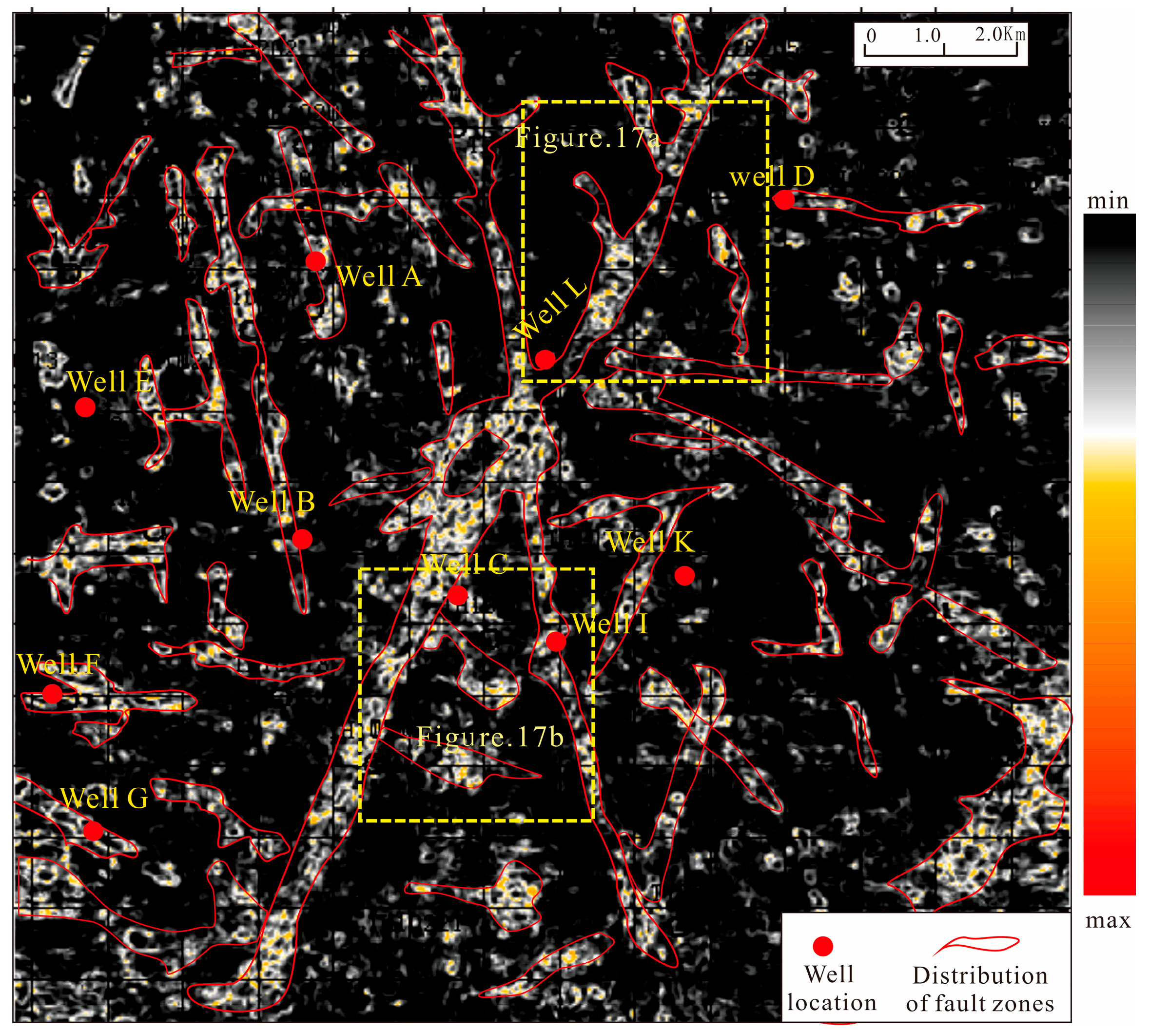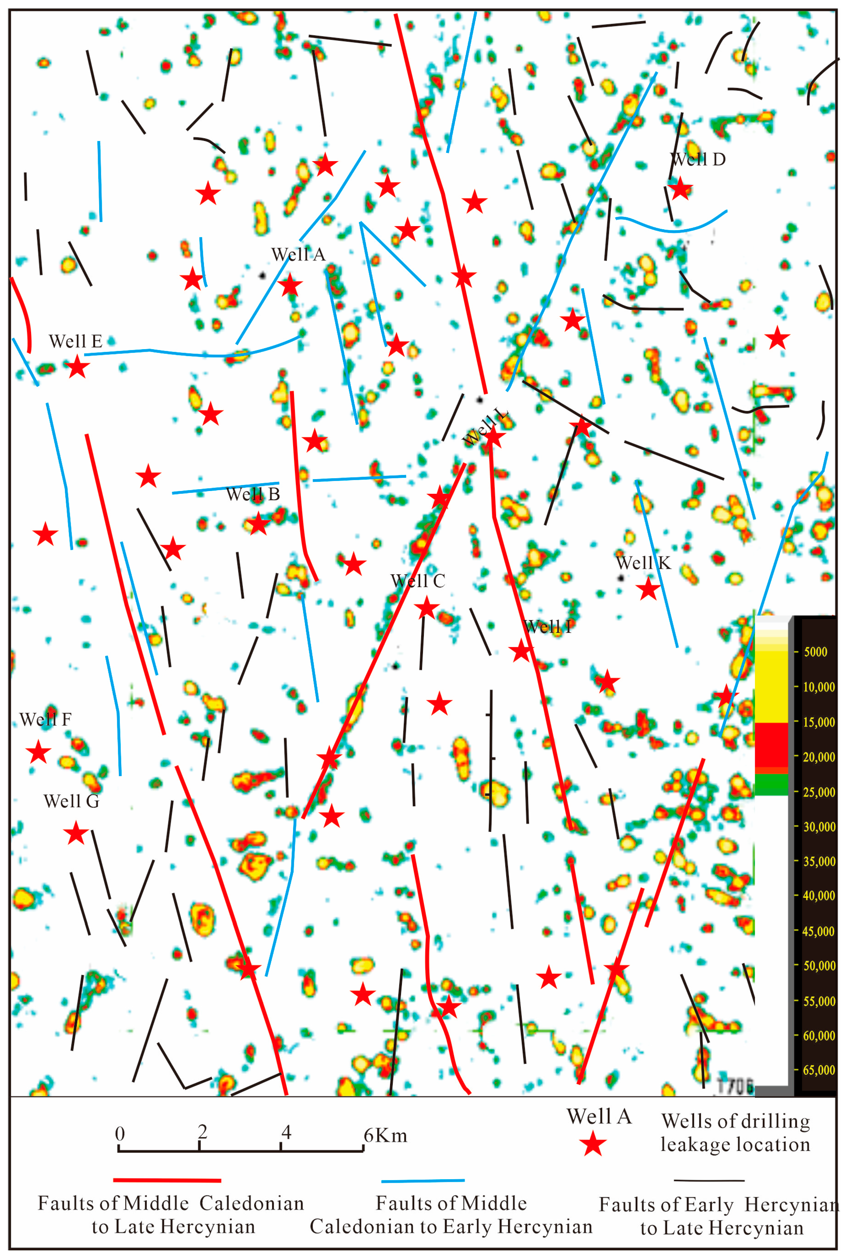 The congruent map of amplitude change rate attributes and fault systems, showing the fracture cave reservoirs controlled by faults.