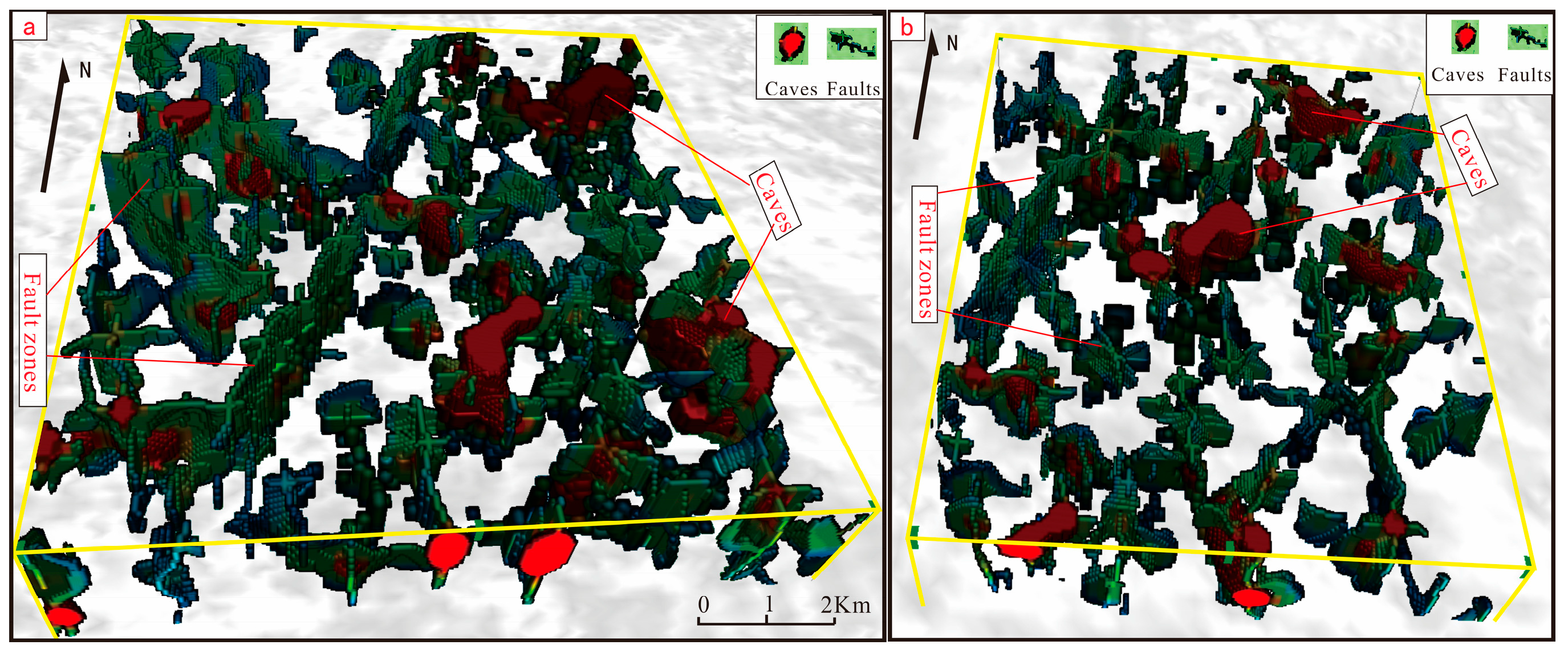 Maps of 3D sculpture of fault and cave bodies (a,b).
