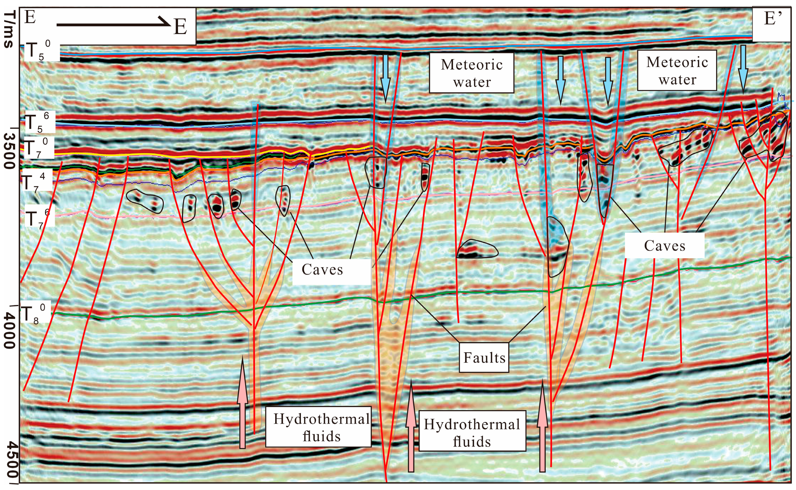 The Early Hercynian is the most critical tectonic movement for the formation and development of fault-controlled carbonate reservoirs in the study area. Driven by NW–SE trending regional stress, the inherited strike-slip faults from the Middle Caledonian became highly active, with both the scale of activity and the width of the fault zones increasing. Meanwhile, a series of faults and folds with NNW, NW, and NE trends were formed. These large-scale strike-slip faults extended upward to the T57 interface and downward to the T90 interface. Faults connecting the surface created long-term conditions for atmospheric freshwater to infiltrate and dissolve the Middle-Lower Ordovician limestone strata along the faults and fracture zones. Additionally, thermochemical sulfate reduction (TSR) occurred in the deep formation, generating substantial amounts of H2S and CO2 during the thermal degradation of organic matter in the strata. The dissolution fluid converges to the fault zone and migrates upward to where fractures and a dissolution vuggy layer formed in the early stage, and dissolution transformation occurred to form new reservoirs. The well-preserved large-scale karst caves, the dissolution vuggy layer, and the fracture reservoir were clearly controlled by faults and were found distributed along the fault zones (Figure 19).