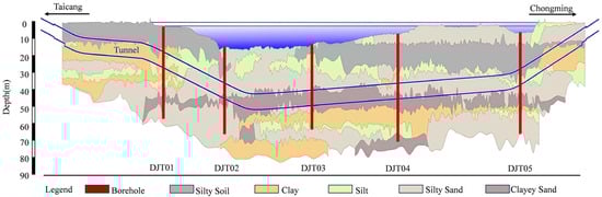 This study incorporates CPTU data from a tunnel construction project between Chongming Island and Taicang in Shanghai, China, thereby extending coverage of riverine, offshore, and deeper stratigraphic conditions [45]. Five representative boreholes were selected, yielding a total of 34,203 samples, and the CPTU data were recorded at an interval of 1 cm, with a maximum penetration depth of 69.88 m. The study area is located in the Yangtze River Delta and is influenced by both the hydrodynamic forces of the Yangtze River and the tidal action of the East China Sea, resulting in stratigraphic sequences characterized by alternating marine and terrestrial facies. These deposits are mainly composed of loose clastic and muddy sediments. From the Pliocene to the Holocene, the region underwent pronounced sedimentary evolution from continental to marine environments, successively developing fluvial, estuarine–bay, shallow-marine, and deltaic depositional facies that reflect the changing sedimentary environments of the Yangtze River Delta. Figure 2 shows the geological profile and borehole locations of the Chinese engineering project.