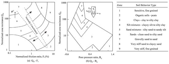 In 2009, Robertson updated his earlier soil behavior type charts, as illustrated in Figure 3a,b, by introducing the stress-normalized cone resistance (Qtn), in which an exponent n was incorporated to account for stress level effects. The formulas for Qtn and n are shown in Equation (6) and Equation (7), respectively.