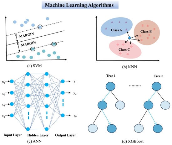 The K-Nearest Neighbors (KNN) is an intuitive and commonly employed supervised learning algorithm. As illustrated in Figure 4b, it classifies a test sample by computing its distances to the training samples, selecting the k nearest ones, and inferring the label based on their classes. In classification tasks, the class occurring most frequently among the neighbors is usually assigned as the prediction [32].