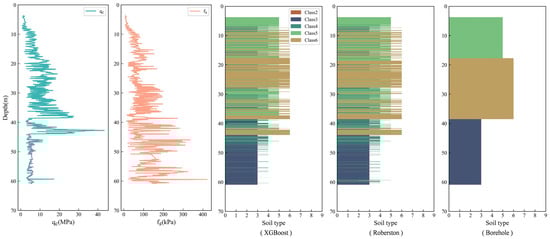 CPTU data and stratigraphic prediction obtained with the XGBoost model, in comparison with Robertson’s SBTn-based classification and adjacent borehole stratigraphy from the Guangzhou site, China.