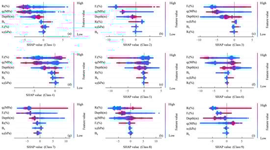 In this section, SHAP (SHapley Additive exPlanations) is applied to interpret the XGBoost algorithm trained with the feature set Depth, qt, Rf, Bq, Fr, and u2. This analysis provides insights into the contribution of each feature to class predictions. Figure 7 presents the feature-level explanations across the nine classes. Each point denotes the SHAP value of a specific observation for a given feature, with the x-axis representing the SHAP value and the color gradient reflecting the magnitude of the feature value from low (blue) to high (red). Features are ranked by importance, where larger absolute SHAP values indicate a more significant influence on the predictions [49].