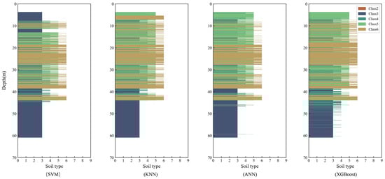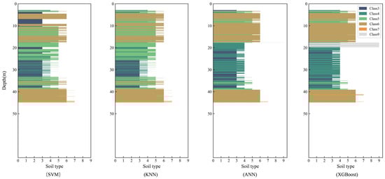 Results in Section 3.1 indicate that XGBoost achieved the best performance across the three test sets. In Section 3.2, the model was further applied to unseen data from Guangzhou and New Lock, where it also exhibited strong predictive capability. To investigate why SVM, KNN, and ANN underperformed relative to XGBoost, we applied these three algorithms to the same unseen data from Guangzhou and New Lock used in Section 3.2. Figure 8 and Figure 9, respectively, illustrate the stratigraphic predictions of the four algorithms for the two sites.