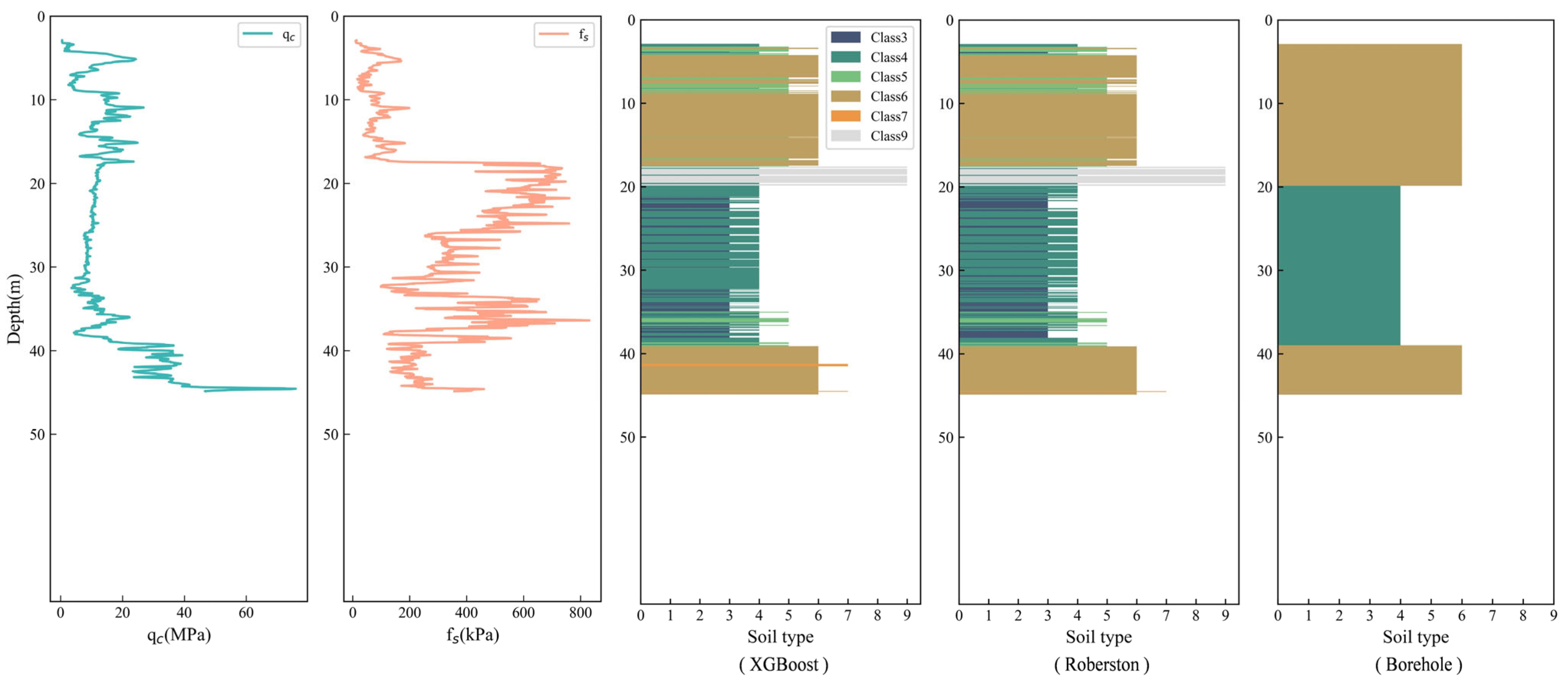 - The model demonstrates strong predictive capability when applied to new sites, showing well adaptability to unseen data. In engineering practice, it can be used as a rapid and cost-effective tool for preliminary stratigraphic interpretation and soil-type identification in tunneling, foundation, and slope projects, supplementing conventional borehole investigations.