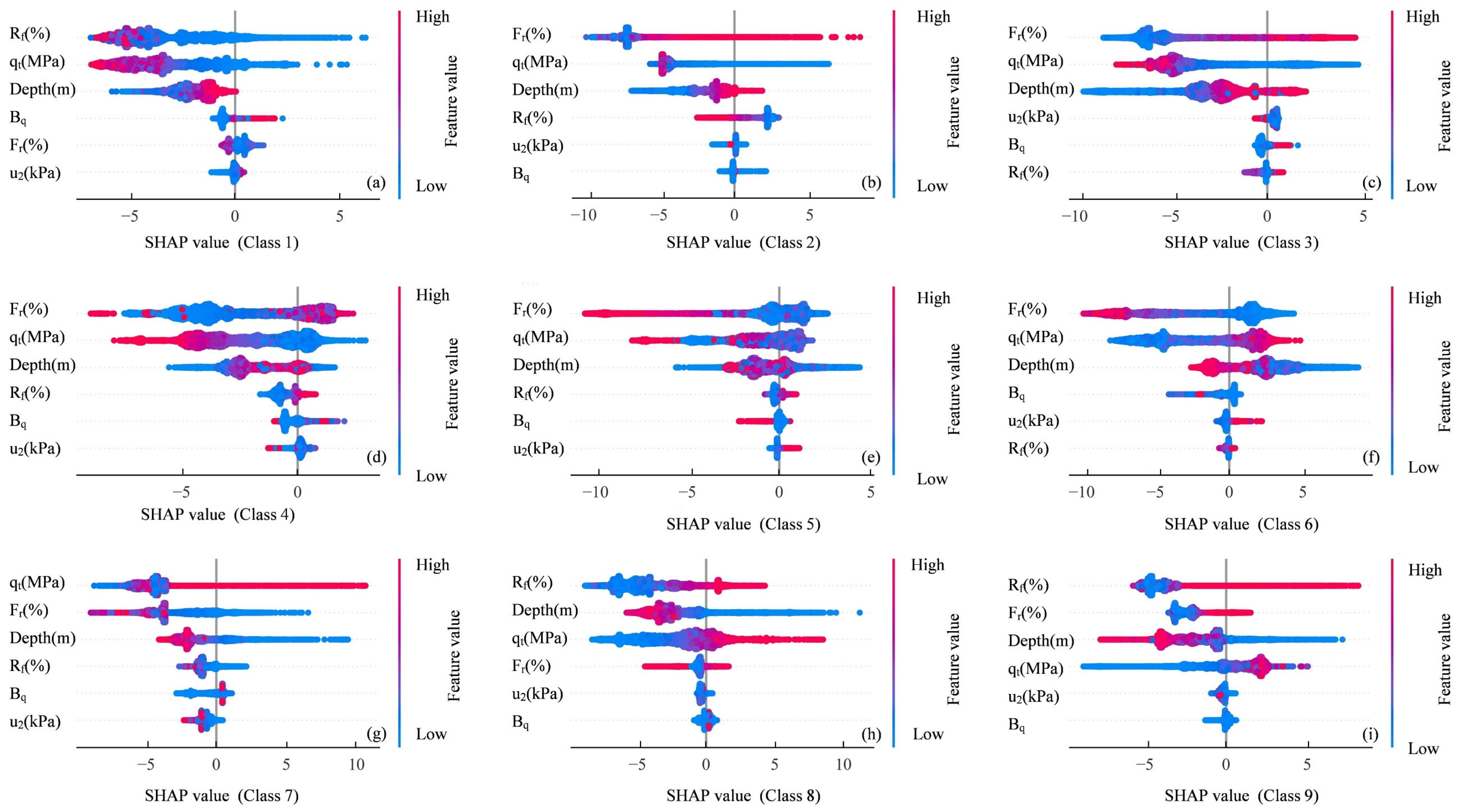 - The model using the feature set Depth, qt, Rf, Bq, Fr, u2, and the XGBoost algorithm performed best. Compared with SVM, KNN, and ANN, XGBoost can better capture nonlinear relationships and handle class imbalance in soil classification, while its regularization effectively reduces the risk of overfitting, leading to better predictive reliability.