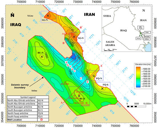 A 3D post-stack time-migrated seismic dataset covering ~113 km2 across the Missan oilfields in southeastern Iraq was employed (Figure 2). The dataset, provided by the Iraqi Oil Exploration Company (OEC), has a 2 ms vertical sampling interval, 25 × 25 m bin size, and a dominant frequency of 28–30 Hz, yielding moderate vertical resolution suitable for horizon and fault delineation. Seismic interpretation was conducted in Schlumberger Petrel, and detailed mapping of structural and stratigraphic elements was achieved.