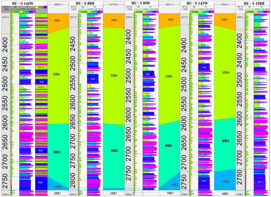 The sonic log measures the travel time (Δt) of acoustic waves as they propagate through geological formations in boreholes, providing essential insights into lithological characteristics [46]. Reliable lithological differentiation of evaporitic sequences—even those comprising thin interbeds—can be achieved using a combination of sonic and gamma-ray logs. Laboratory measurements and borehole data confirm that sonic values for pure halite typically range between 67 and 69 µs/ft. In contrast, anhydrite exhibits lower sonic values due to its higher density and rigidity, which allow faster acoustic wave transmission. Shale, despite its comparable density, exhibits higher sonic readings due to its greater porosity and produces elevated gamma-ray responses resulting from its enriched radioactive mineral content. Figure 3 displays sonic and gamma-ray logs from five representative wells in the southern Buzurgan oilfield, illustrating clear differences in MB2 thickness, an interval composed entirely of salt.