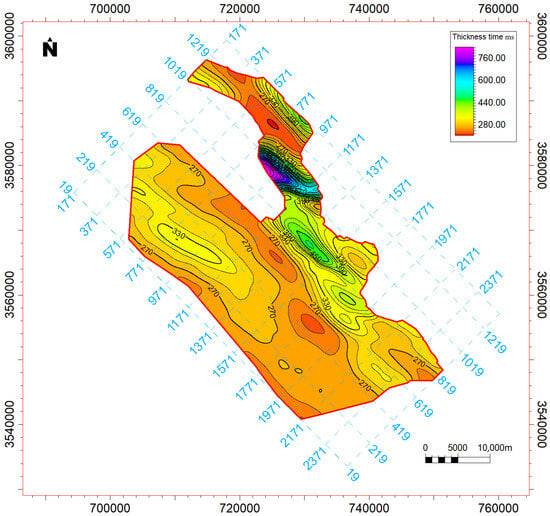 Isochron (time-thickness) map of the Mobile Group (MB4–MB2) across the Missan oilfields, illustrating spatial variations in interval thickness. Fault locations are shown for reference in Figure 6.