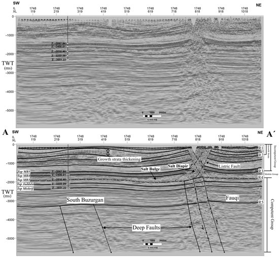 Seismic section A-A′ across the South Buzurgan and Fauqi structures. The upper panel shows the uninterpreted post-stack time-migrated section (inline 1748), while the lower panel presents the interpreted version. Key structural features include deep-seated reverse faults, a salt bulge, a salt diapir, and listric faulting above the Mobile Group. Stratigraphic horizons and mechanical stratigraphy (Competent, Mobile, and Incompetent Groups) are also highlighted. The reflectors R1 to R5 represent key seismic horizons used for interpretation and analysis. The location of this seismic section is shown in Figure 2.