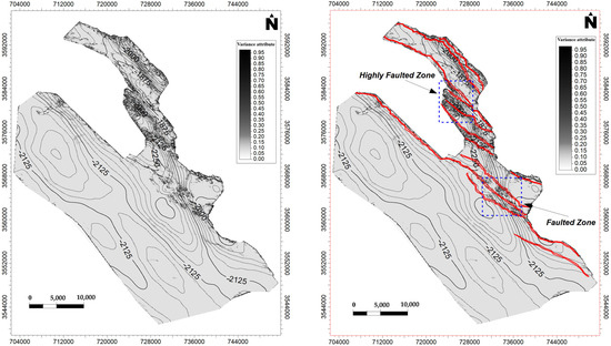 The variance attribute (Figure 7) highlights a strong spatial correspondence between high-variance anomalies and the fault traces interpreted from the time-structure map (Figure 6). This agreement supports the effectiveness of the variance attribute for fault detection and reinforces the reliability of the mapped fault geometries across the study area.