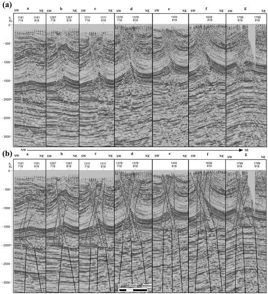 (a) Non-interpreted and (b) interpreted parallel inline seismic sections trending southeast, perpendicular to the fold axis on the western limb of the Fauqi fold. The sequence from (a) to (g) illustrates the progressive deformation and diapir development of the Mobile Group, coinciding with the weakening of the overburden by deep-seated faults and driven by deep fault zone activity (location shown in Figure 2).