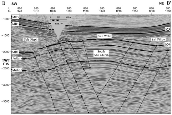 Inline seismic section B–B′ across the Abu Ghirab anticline (location in Figure 2), illustrating intense faulting and fracturing associated with salt deformation within the Mobile Group. The section displays features such as a salt diapir, salt weld, and salt pillow, along with deep-seated basement faults that significantly influenced the structural evolution and hydrocarbon migration in the field.