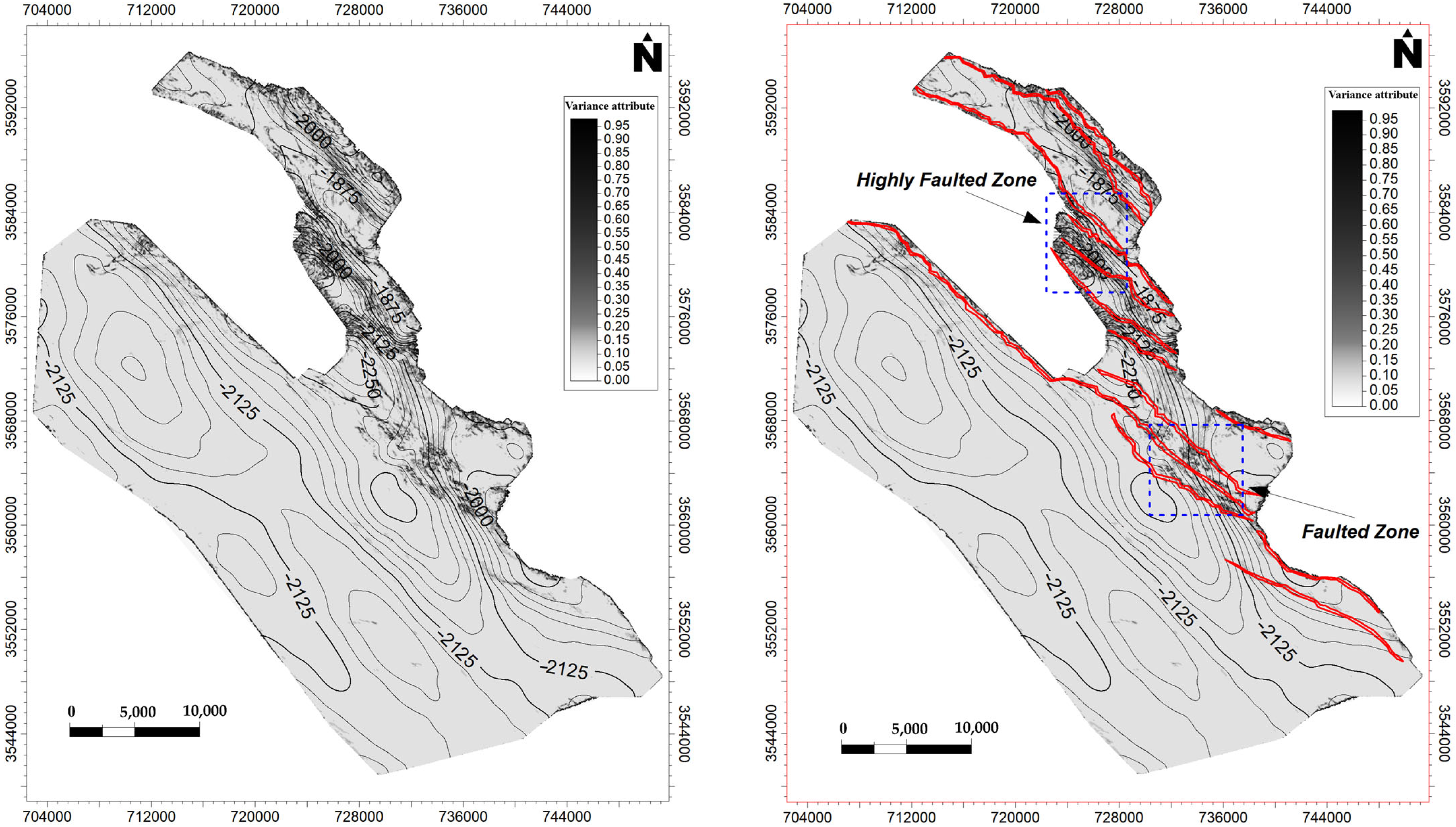 To support the identification of deep-rooted compressional structures, regional fault data were incorporated from both published seismological sources and the tectonic map of Iraq. This national map, developed using 2D seismic interpretation, highlights the presence of reverse and thrust faults that traverse the study area. These features were used to guide and constrain the structural interpretation of the 3D seismic volume. To further enhance the visualization of fault geometries and stratigraphic discontinuities—particularly within the Jaddala Formation—a variance attribute was applied using a trace-to-trace similarity algorithm. The resulting attribute volume was compared with depth-structure maps to verify fault continuity and increase confidence in the interpreted structural framework.