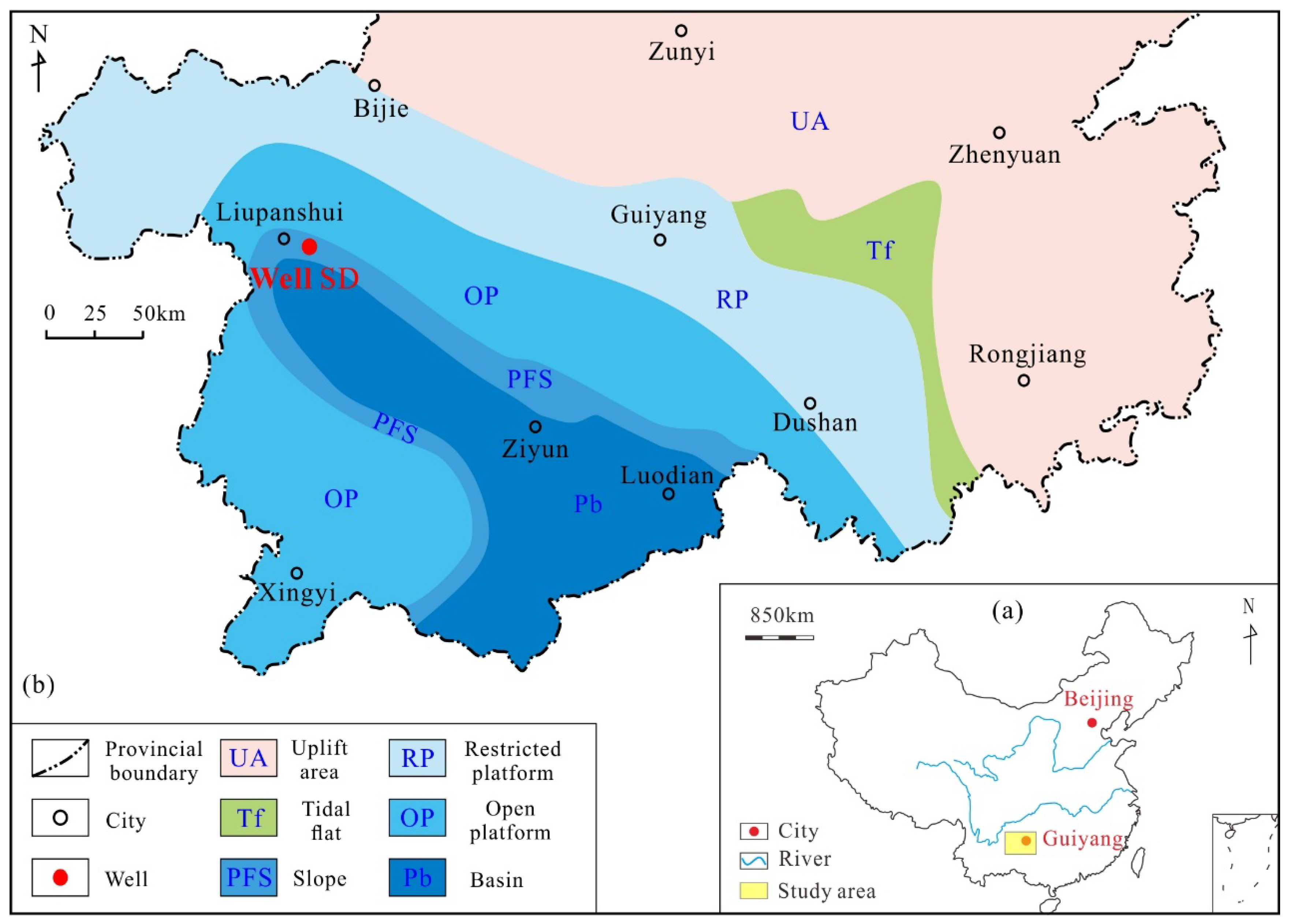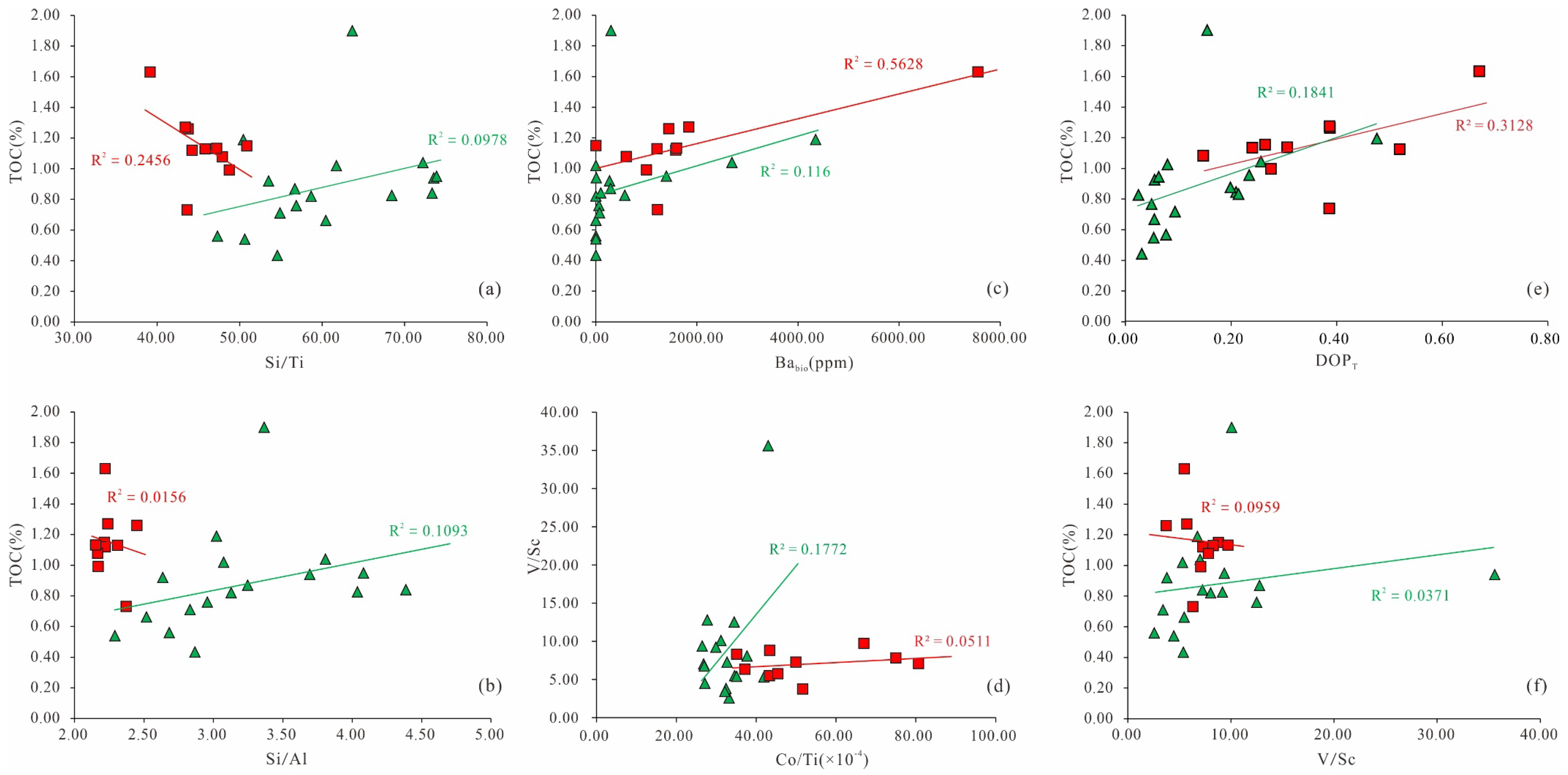 - Sediments of the Dawuba Formation are characterized by overall low TOC contents, comprising two distinct types: organic-containing sediments (1.00% < TOC < 2.00%) and organic-poor sediments (TOC < 1.00%). The accumulation of organic matter in these sediments is collectively controlled by three key factors: redox conditions, primary productivity, and terrigenous detrital flux.