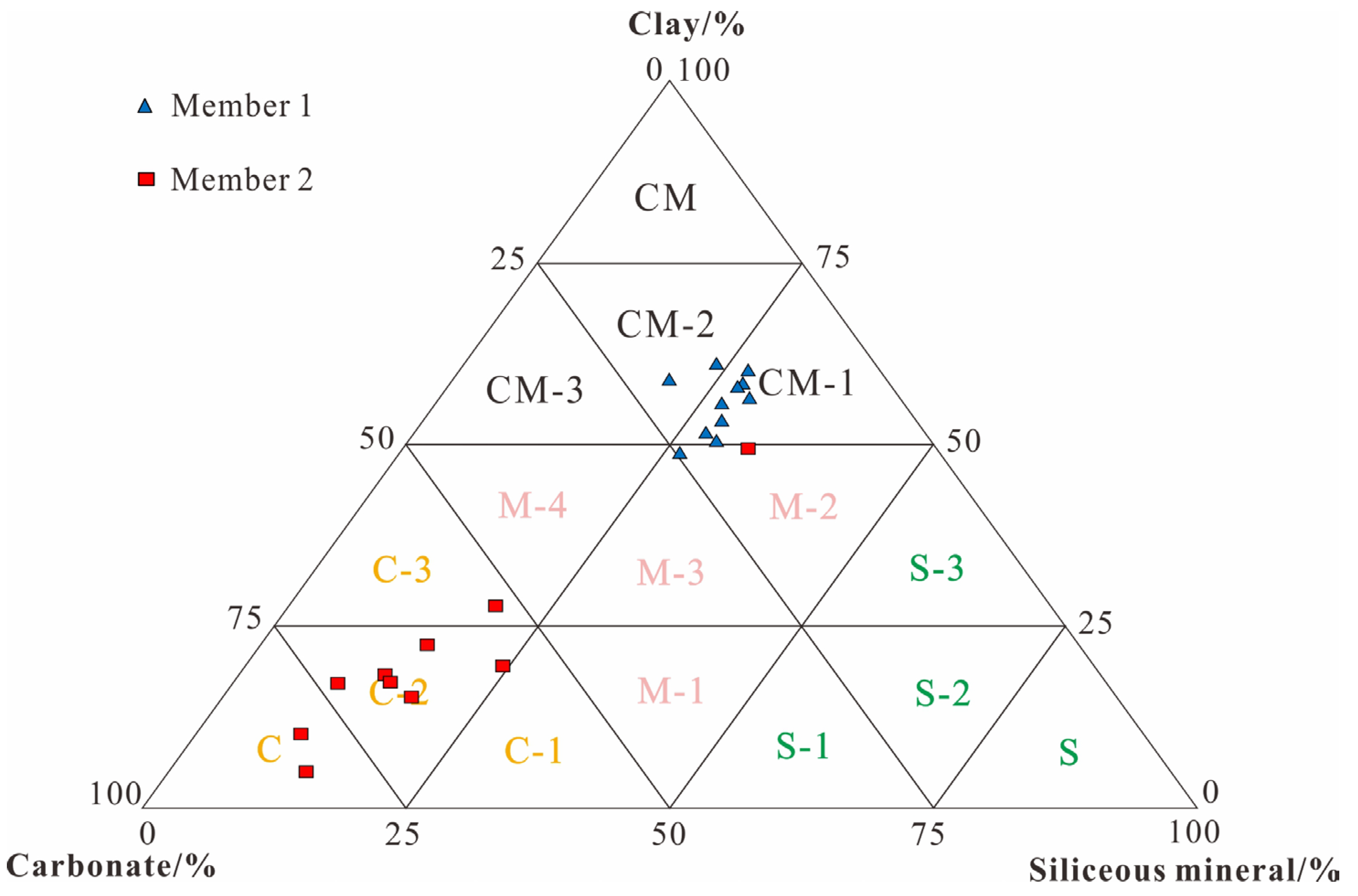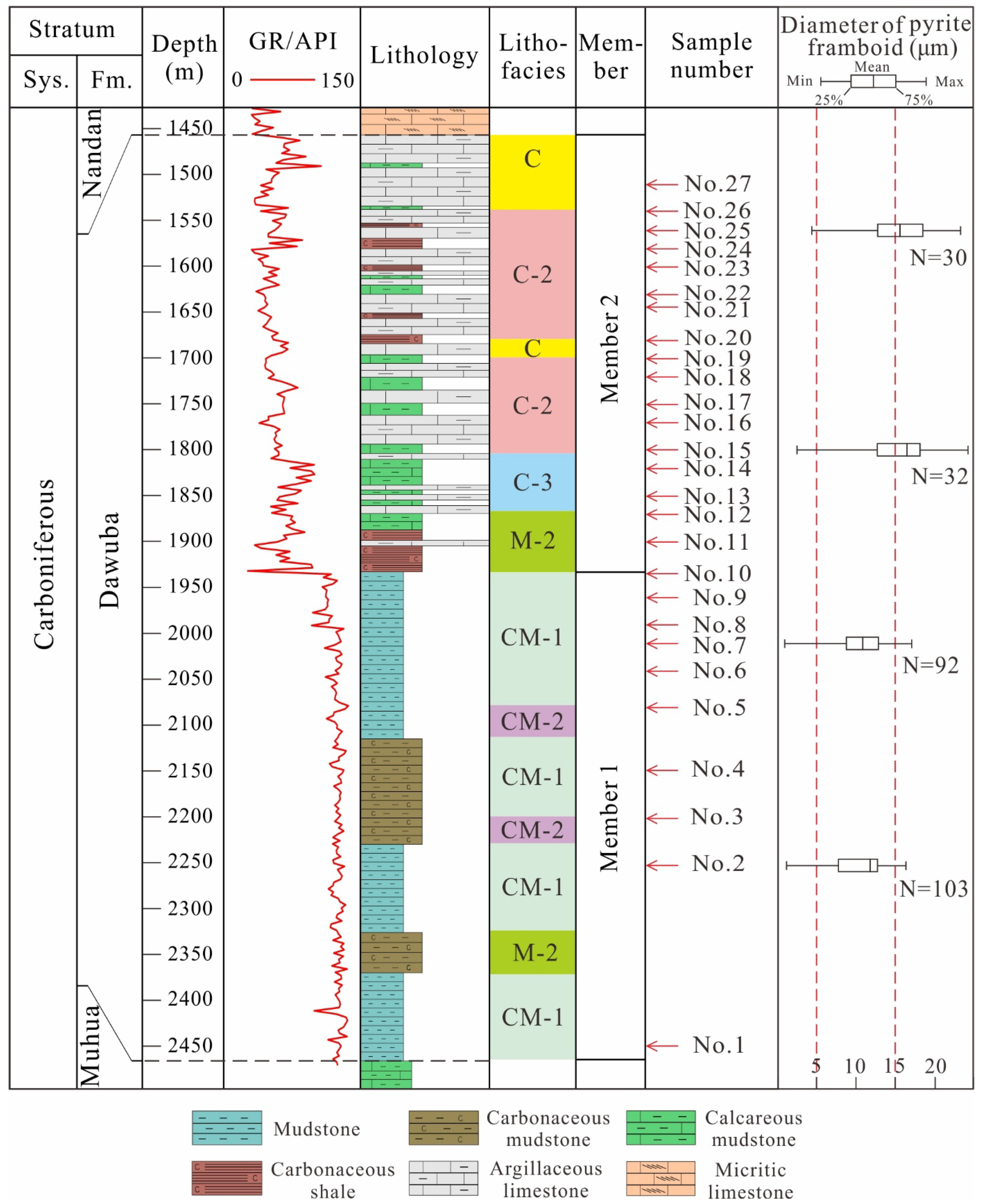 - The Early Carboniferous Dawuba Formation in the Qiannan Depression comprises two members: Member 1 is characterized by the CM-1 lithofacies (thick-bedded mudstone), while Member 2 is dominated by the C-2 lithofacies (marl).