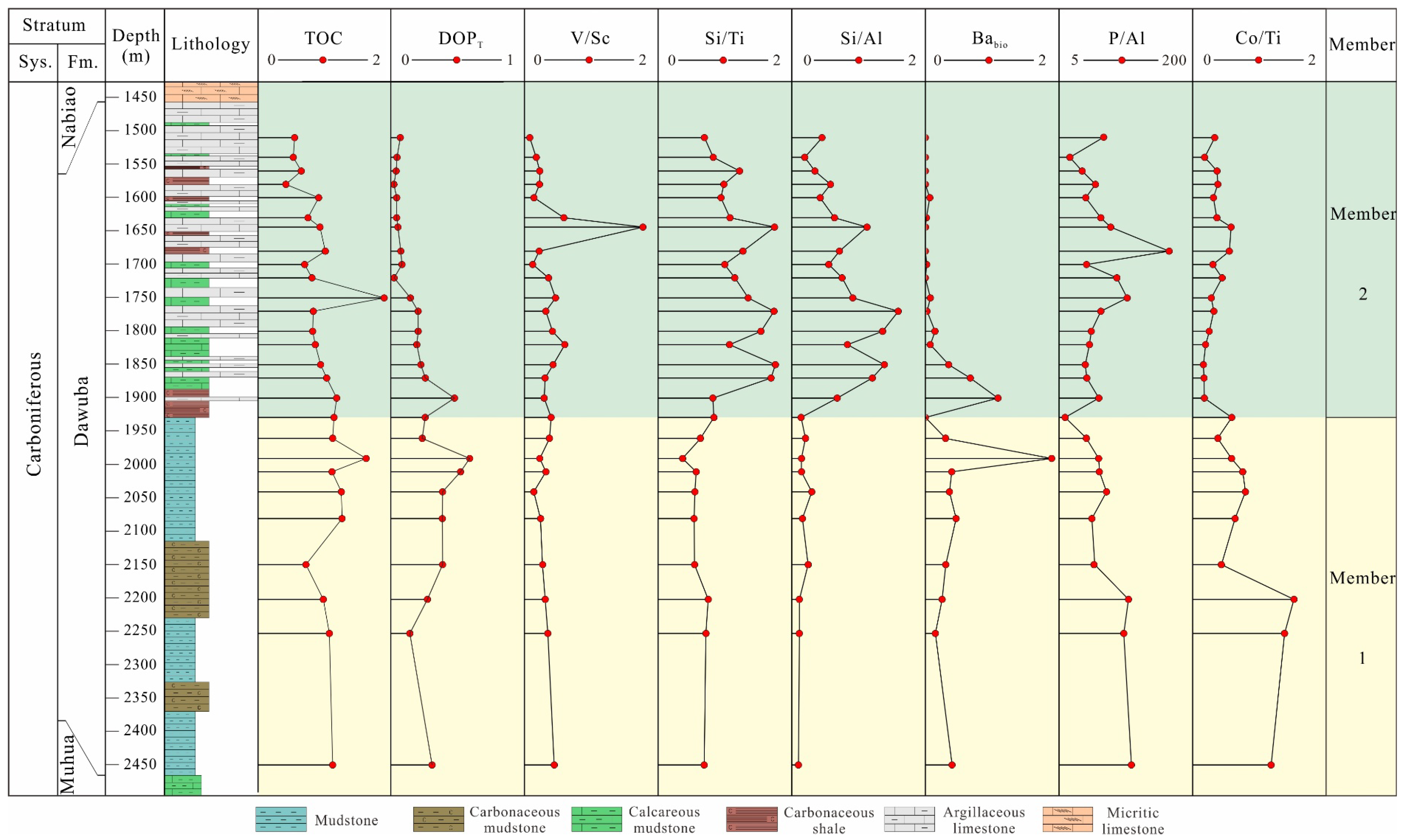 | Depth/m | Member | DOPT | V/Sc | Si/Ti | Si/Al | Babio(ppm) | P/Al | Sr/Ba | Co/Ti (×10−4) |