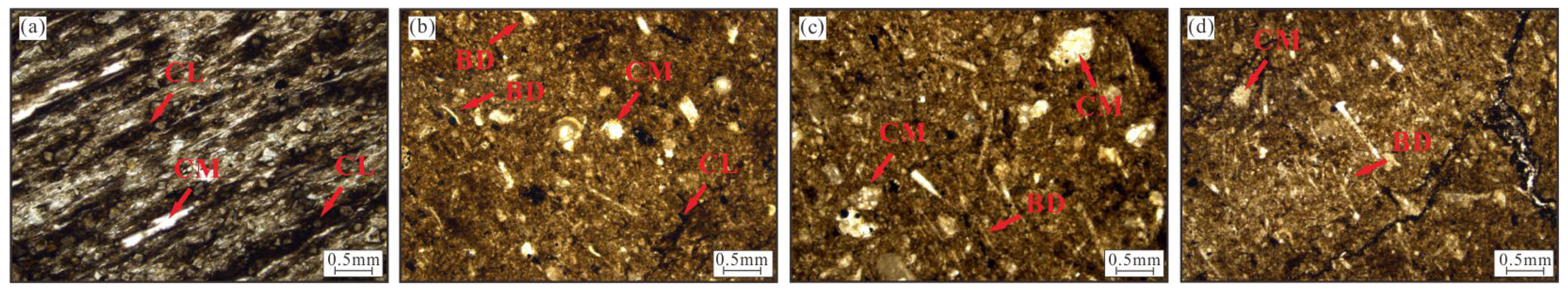 - Xu, H.Y.; Hou, D.J.; Löhr, S.C.; Liu, Q.Y.; Jin, Z.J.; Shi, J.Y.; Liang, X.P.; Niu, C.K.; George, S.C. Millimetre-scale biomarker heterogeneity in lacustrine shale identifies the nature of signal-averaging and demonstrates anaerobic respiration control on organic matter preservation and dolomitization. Geochim. Et Cosmochim. Acta 2023, 348, 107–121. [Google Scholar] [CrossRef]