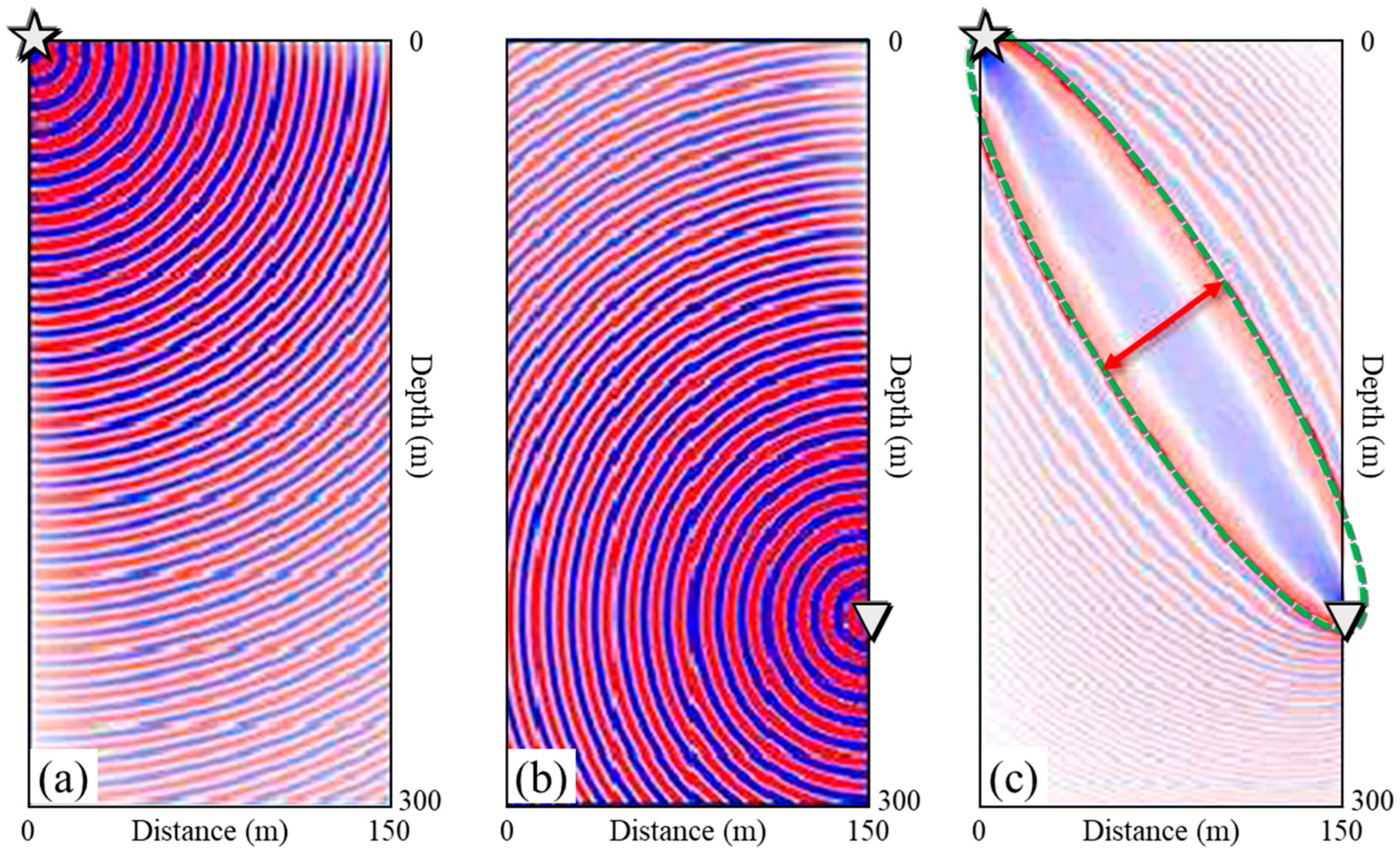Figure 1. An illustration of Fresnel zones of wavefields in a model of constant velocity of 3 km/s (after [41]). (a) Transmitted wavefield of 300 Hz from a source (star). (b) Transmitted wavefield of 300 Hz from a receiver (triangle). (c) The combined wavefield is a superposition of two wavefields in (a,b), consisting of elliptical wavefronts known as Fresnel zones due to interferences between the two monochromatic wavefields. The width of the first Fresnel zone (green dashed ellipse) is the horizontal resolution (red line with arrows).