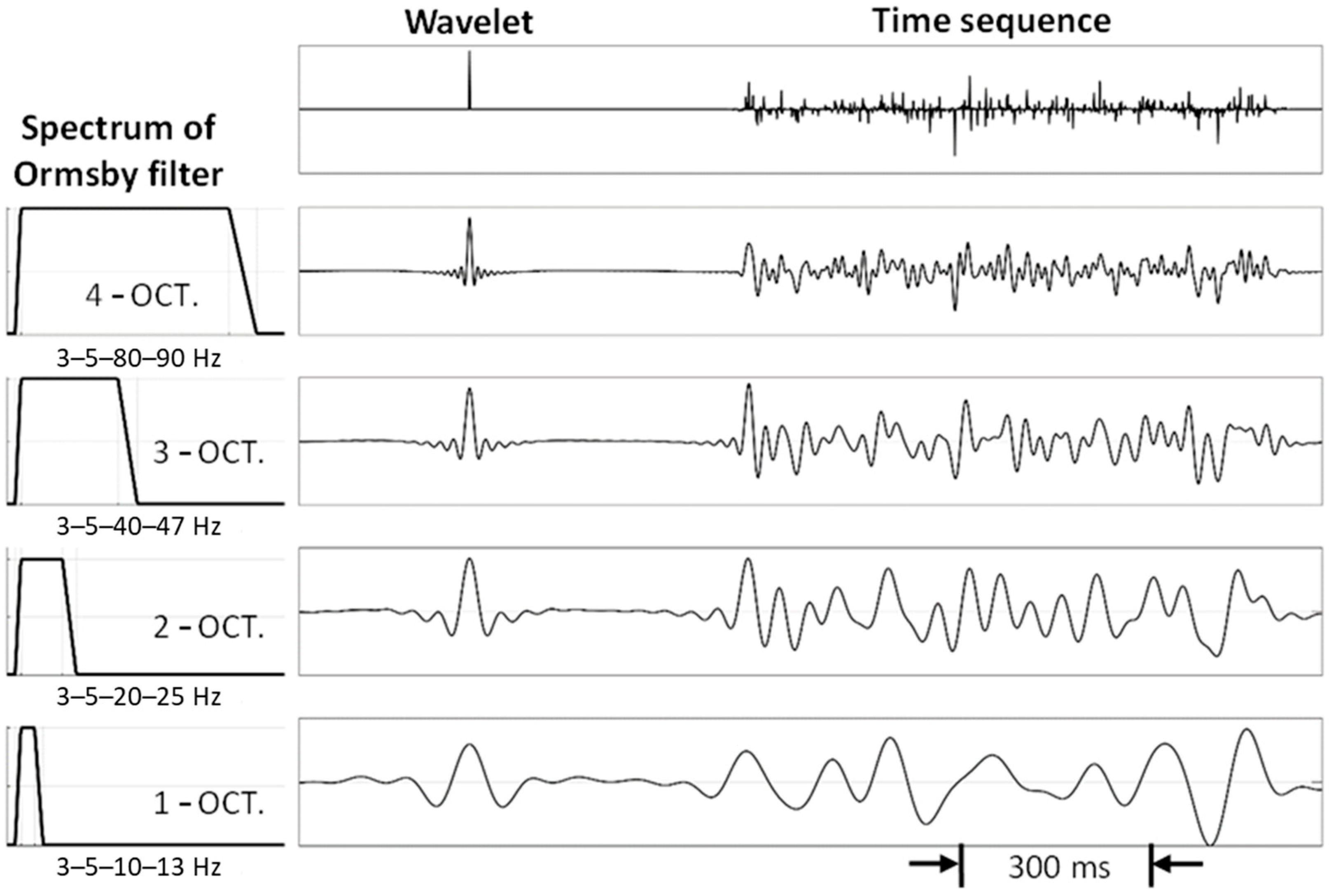 Following [43], the top row of Figure 2 shows an impulse wavelet and a reflectivity function, over four band-limited traces after Ormsby filtering. All filtered wavelets have sidelobes of wiggles due to limited bandwidth. While the impulse wavelet has only positive amplitude, all filtered wavelets have positive and negative wiggles with a zero-mean amplitude. Filtering out low frequencies is a demeaning process. As the frequency bandwidth of the filtered wavelets in Figure 2 decreases from 4 octaves to 1 octave, the sidelobes of the wavelet increase, raising the overlapping level of neighboring reflectors. Hence, narrowing the frequency bandwidth means increasing the level of overlapping neighboring reflectors. Conversely, the broader the frequency bandwidth, the higher the time-domain resolution due to less energy in the sidelobes of all reflectors.