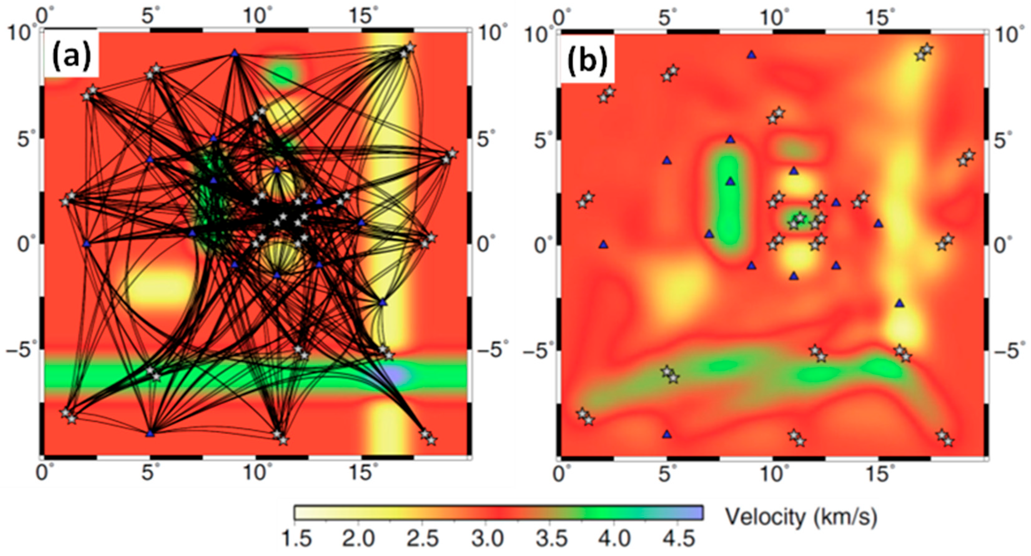 Figure 3. Synthetic reconstruction test by Rawlinson et al. [47]. (a) Raypaths from 40 sources (white stars) to 14 receivers (blue triangles) in the synthetic true velocity model. (b) Reconstructed model using an initial model of a uniform velocity of 3.0 km/s.
