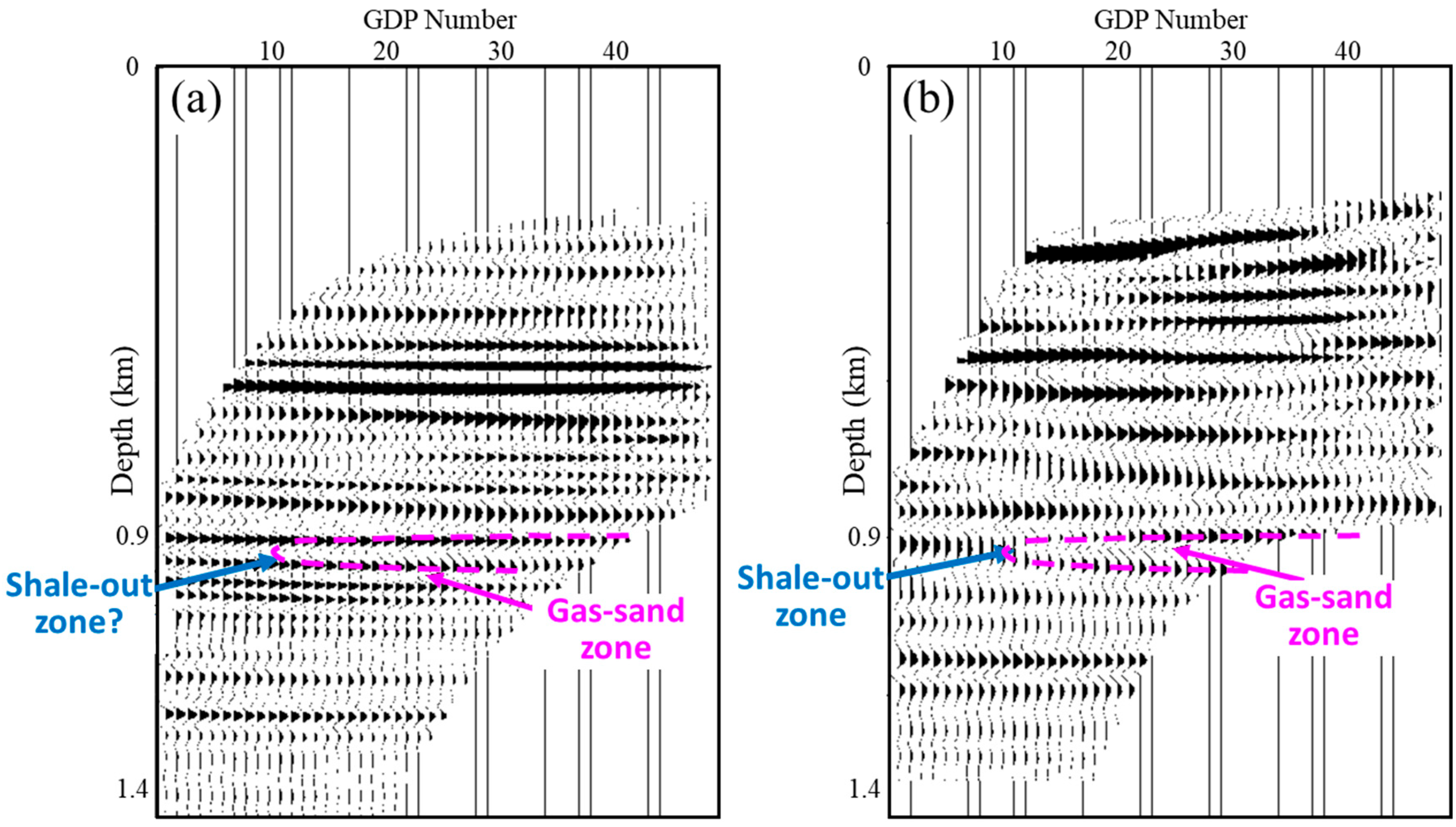 Figure 4 compares two vertical seismic profile (VSP) images produced by two different migration methods [55]. This VSP survey aims at identifying the shale-out zone that seals off the gas-sand zone of a sand layer on the right side of the profile. Although the first image by conventional migration shows higher resolution than the second image by reverse time migration (RTM), we cannot see the pinchout of the gas-sand zone from the first image. In contrast, we can clearly see the pinchout on the RTM image which was produced using both up-going and down-going reflections. This comparison demonstrates that the best resolution alone may not warrant the fidelity of seismic image.