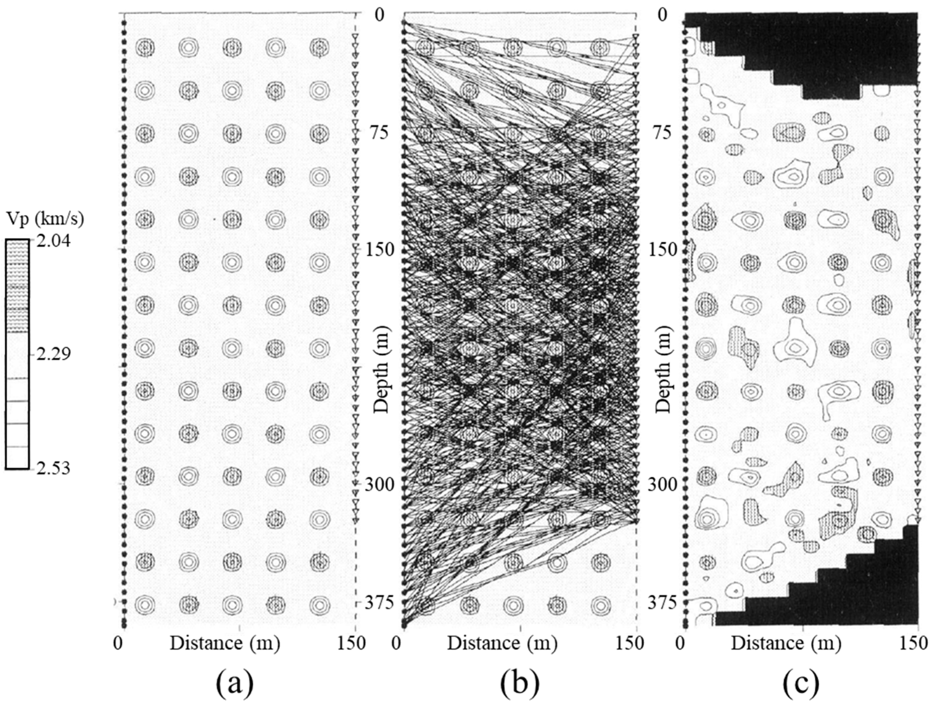 Figure 5. Velocity contour plots of a checkerboard resolution test for a cross-well tomography [56]. (a) Synthetic model of velocity anomalies. (b) First arrival raypaths. (c) Recovered structures, showing uncovered areas in black and some along-raypath smearing artifacts.