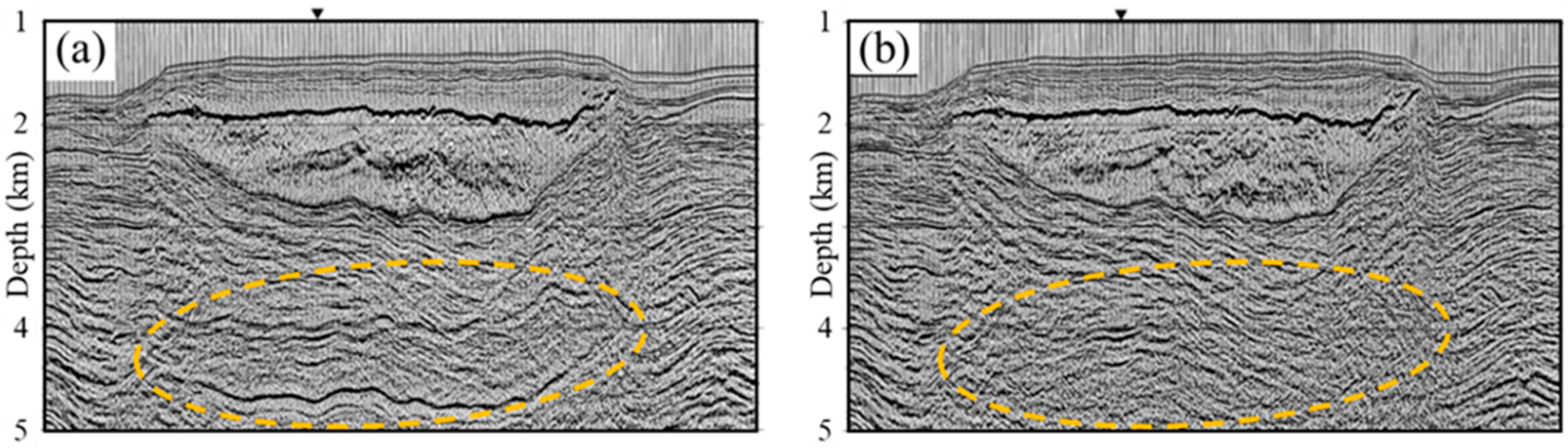 Figure 6. Depth migration profiles showing the effects of using improper signals in seismic imaging [61]. (a) Profile with artifacts in the dashed ellipse from mistaking multiple reflections from salt interfaces as primary reflection signals. (b) After eliminating surface-related multiple reflections in the dashed ellipse.