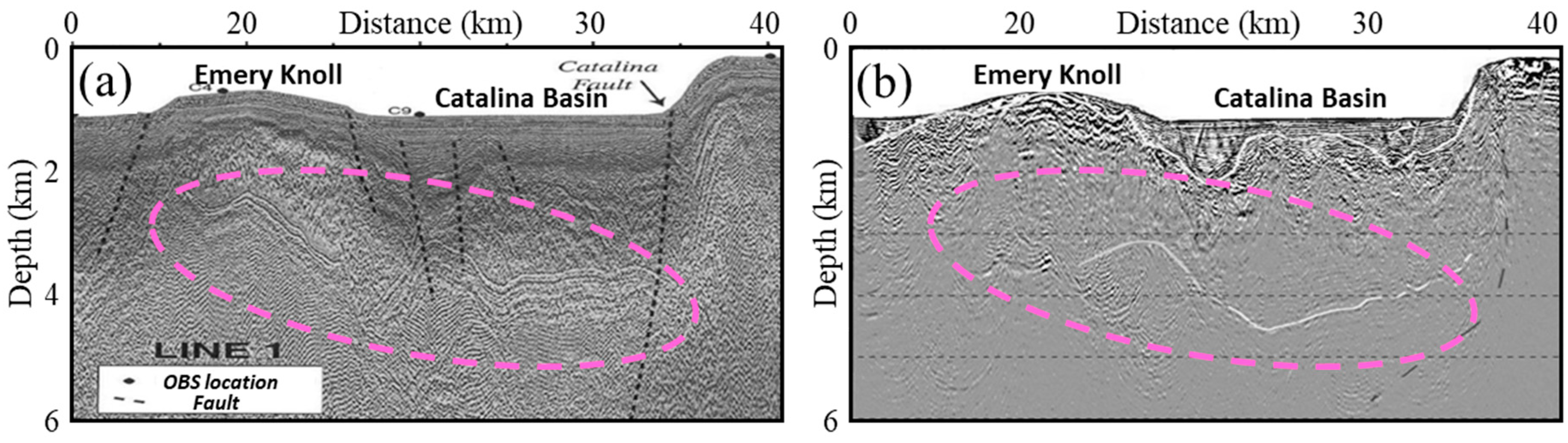 Figure 7. Seismic profiles of LARSE Line 1 produced by (a) normal moveout stacking and (b) RTM [62]. The dashed ellipse in pink color in (a) highlights the artifacts from multiples and sideswipes. Many of the artifacts disappear in (b), though some long-wavelength imaging artifacts appear over shallow sediments.