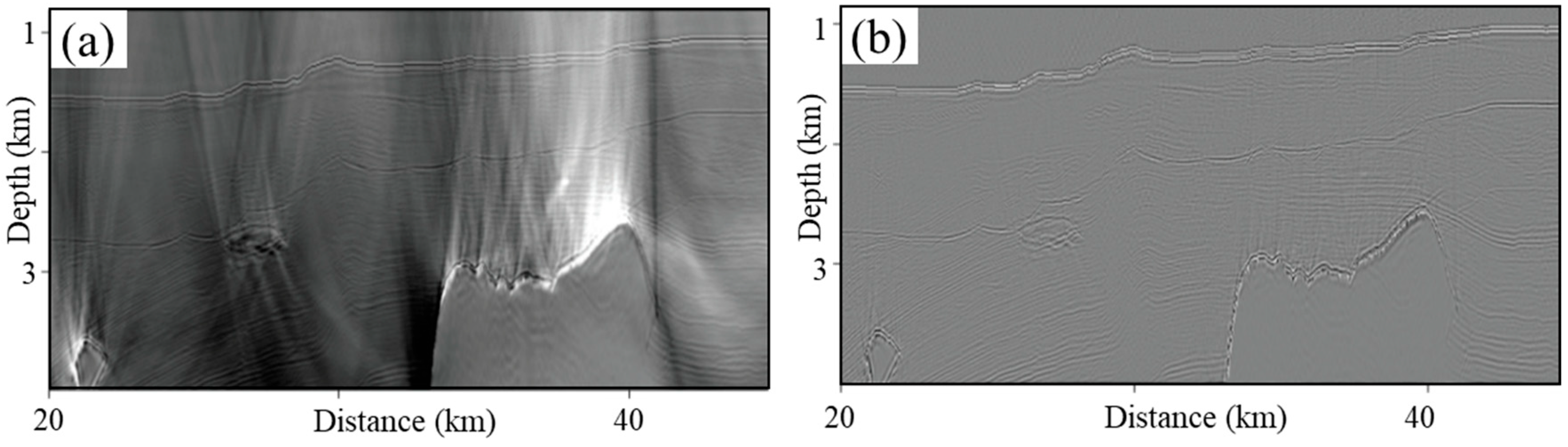 Figure 8. An example of processing artifacts. (a) Seismic reflection profile from RTM imaging, showing low-frequency artifacts due to the cross-correlation imaging condition [63]. (b) After the Laplacian filtering [55].