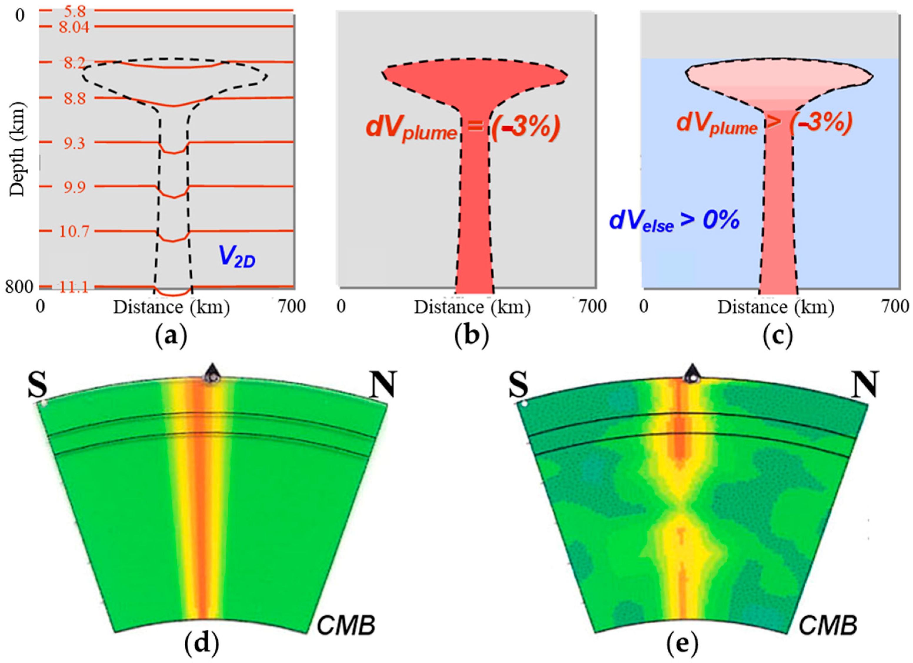 Figure 9. Cartoon cross-sections showing the demean artifact (after [35]). (a) A Vp model containing a plume and the numbers denote velocity contours in km/s. (b) Perfect plume velocity anomaly that is −3% slower than the background 1D velocities in (a). (c) Imperfect plume velocity anomaly after removing the layer averages of (a). Panels (d,e) are the synthetic and inverted models, respectively, of a resolution test along a cross-section beneath Hawaii [64], from surface down to core-mantle boundary (CMB). Reddish, yellow and greenish colors in (d,e) denote slow, neutral and fast velocities, respectively.