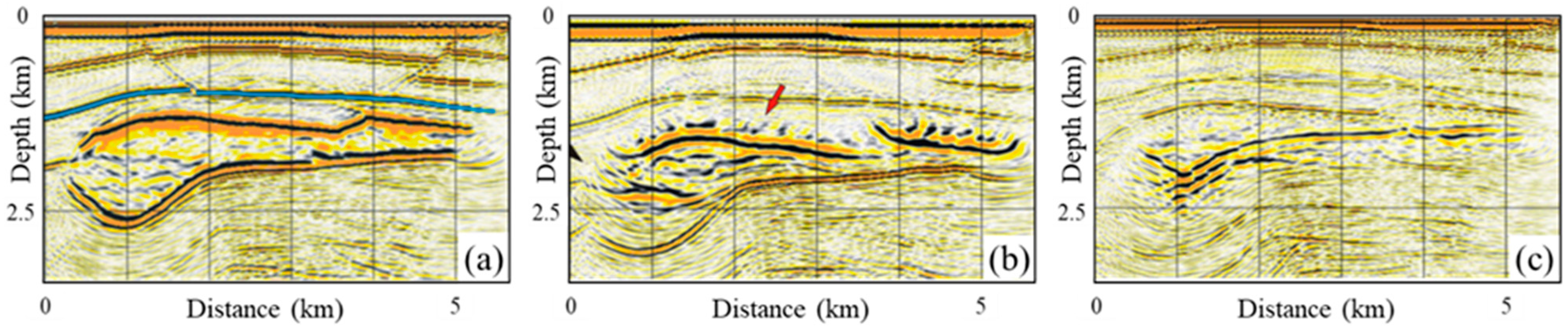In order to map subsurface reflective structures, a good reference velocity model is required by seismic imaging methods, such as reflection stacking, receiver functions, seismic migration, and full waveform inversion. A velocity error produces both position error and image artifact. Figure 10 compares prestack depth migration results using synthetic model data and three different velocity models [65]. The correct velocity model delivered focused reflectors at correct positions in Figure 10a. In contrast, faster or slower velocity models lead to unfocused reflectors at incorrect positions and image artifacts, such as the ‘smile’ artifacts in Figure 10b and ‘frown’ artifacts that appear in Figure 10c, respectively.