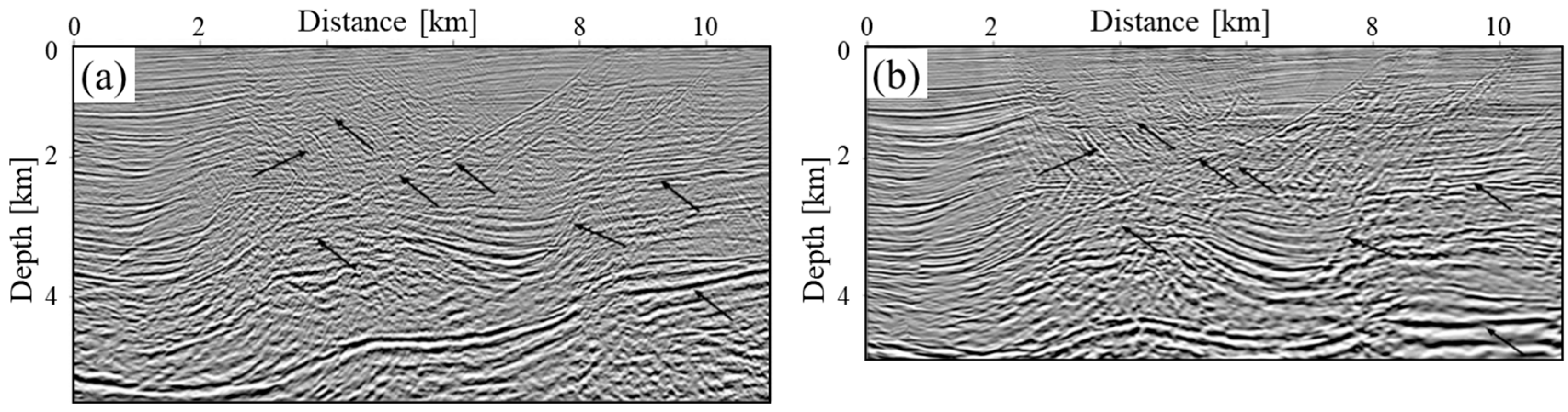 Figure 11. Two reflection profiles based on the same data but different velocity models and imaging methods [69]. (a) Prestack time migration using a VTI velocity model from time processing. (b) Prestack depth migration using a VTI velocity model from migration velocity analysis. The arrows point to similar features that changed positions and appearance.