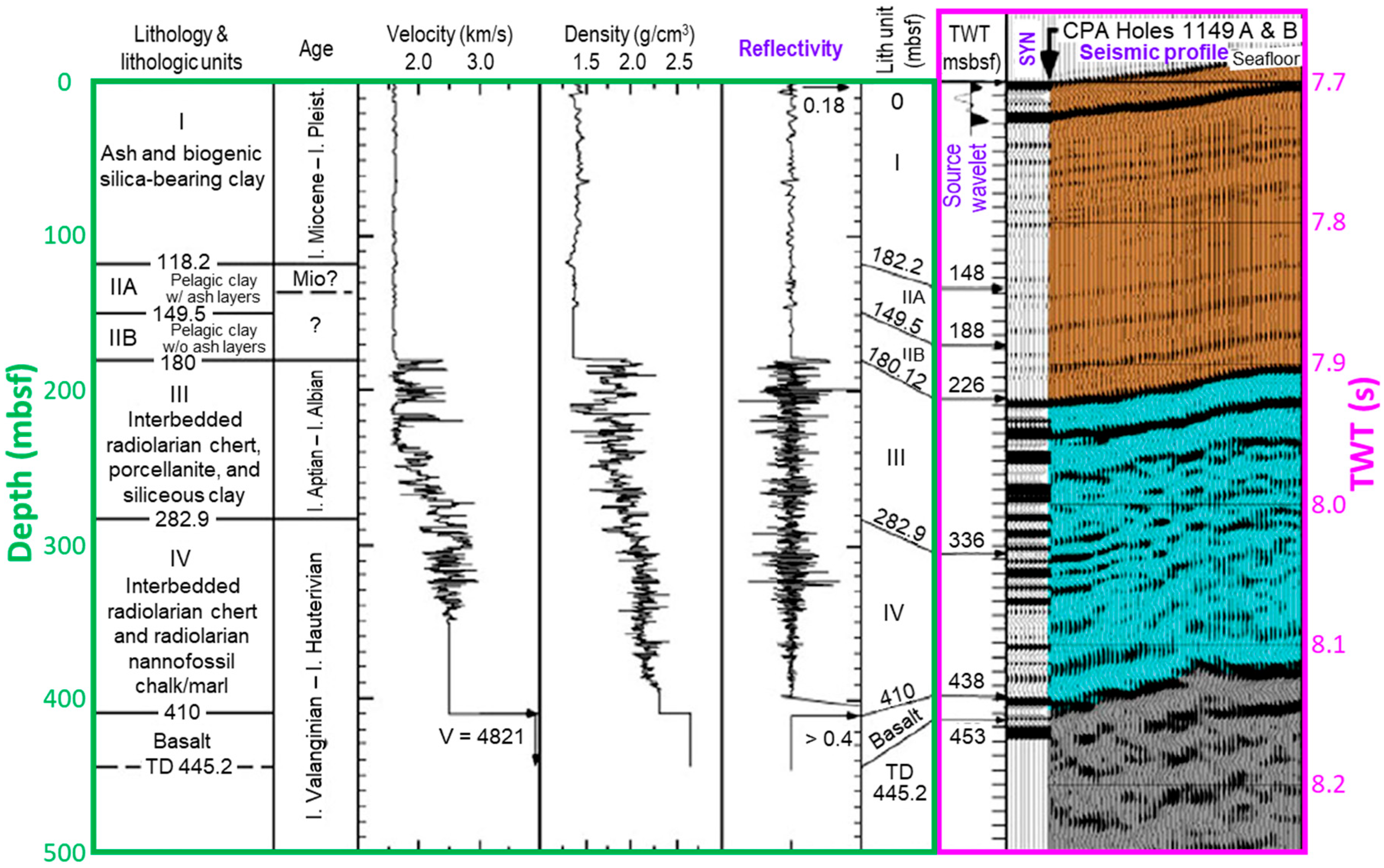 Figure 12. Illustration of tying the well-based lithology, stratigraphy, and reflectivity in CPA Holes 1149 A and B with a color-coded seismic profile in the Nadezhda Basin (after [70]) in the NW Pacific Ocean. Each trace of the synthetic seismogram (SYN) is a convolution of the source wavelet with the reflectivity curve derived from the velocity and density logs. The vertical scale is measured in depth of meters below seafloor (mbsf) for the columns in the green box, and in two-way traveltime (TWT) of milliseconds below seafloor (msbsf) for the columns in the pink box.