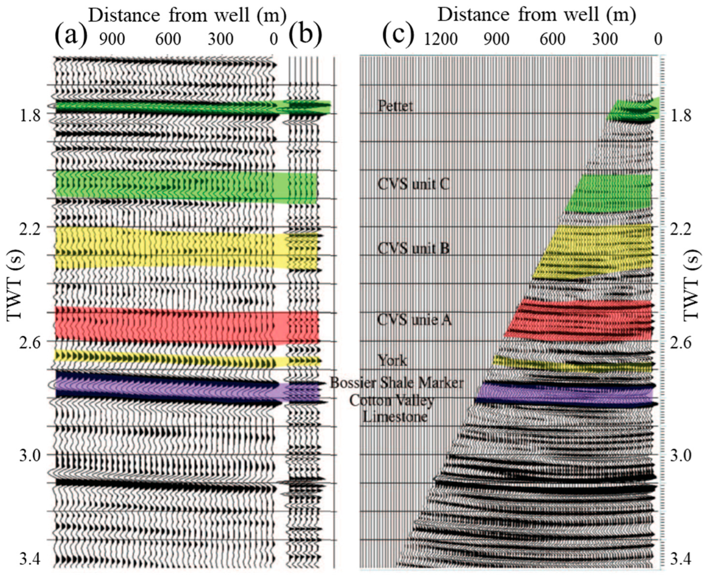 Figure 13. A VSP-seismic tie [71] showing the same formations in color. (a) A seismic profile coincides with the offset VSP. (b) VSP corridor stack. (c) VSP migrated image.