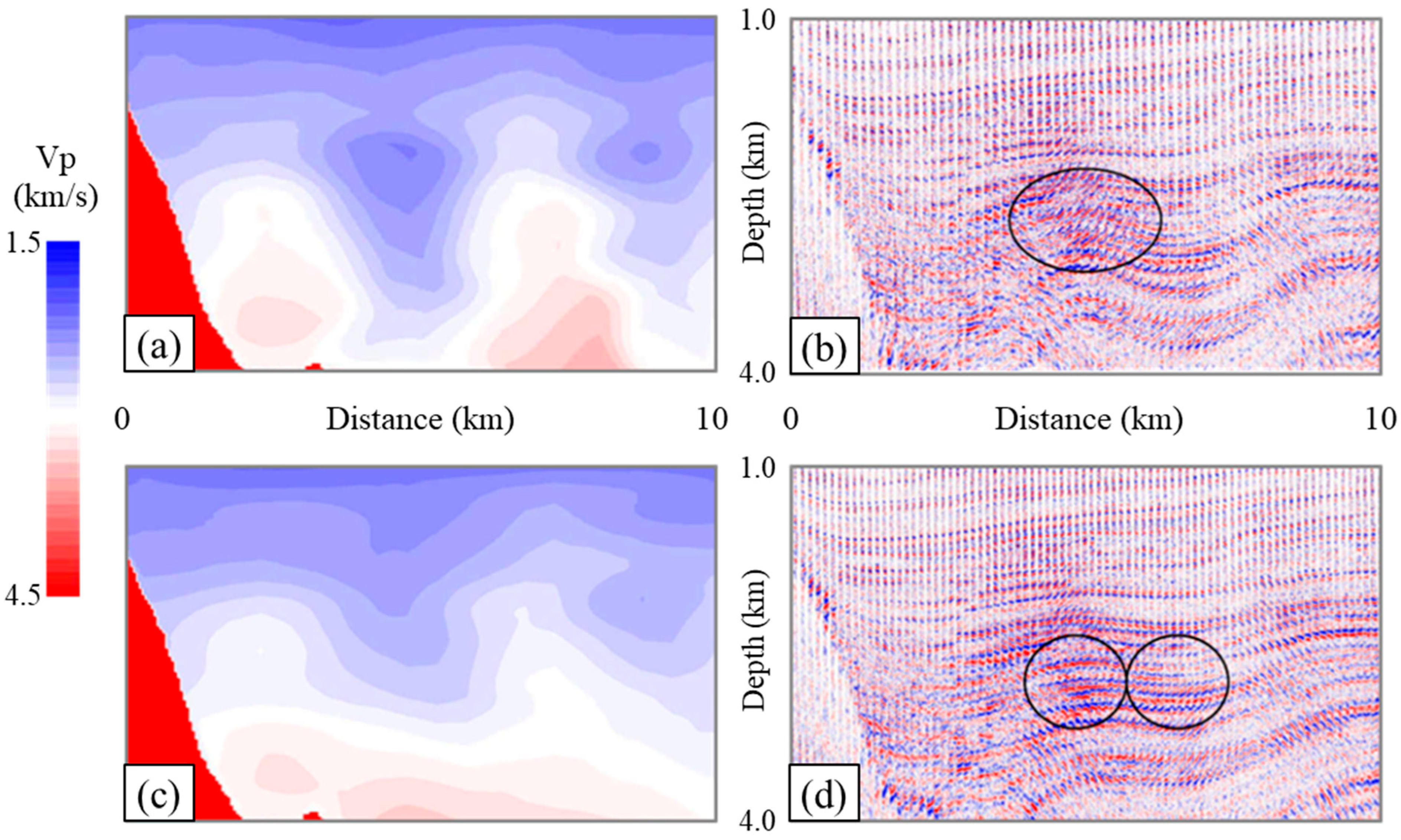 Figure 14. Examples showing the influence of velocity models on the reflectors on common image gathers or CIGs in Gulf of Mexico [76]. (a) Velocity model of a salt body in the lower-left corner and sediments. (b) Migrated CIGs using the model in (a). (c) Updated velocity model. (d) Migrated CIGs using the model in (c). The ellipses in (b,d) highlight areas of improvement in the CIGs.