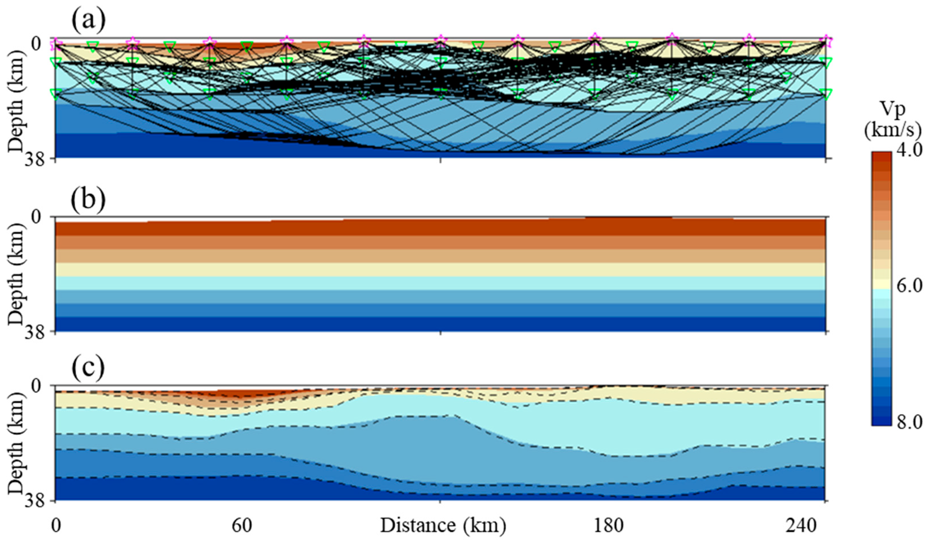 Figure 15. Synthetic reconstruction exercise for evaluating the recovery of velocity interfaces by deformable layer tomography [90]. (a) First-arrival raypaths (black curves) in the synthetic true velocity model. Stars and triangles denote stations and events, respectively. (b) Initial reference model of some constant-velocity layers. (c) Reconstructed velocities in color, in comparison with the true velocity interfaces marked by the dashed lines.