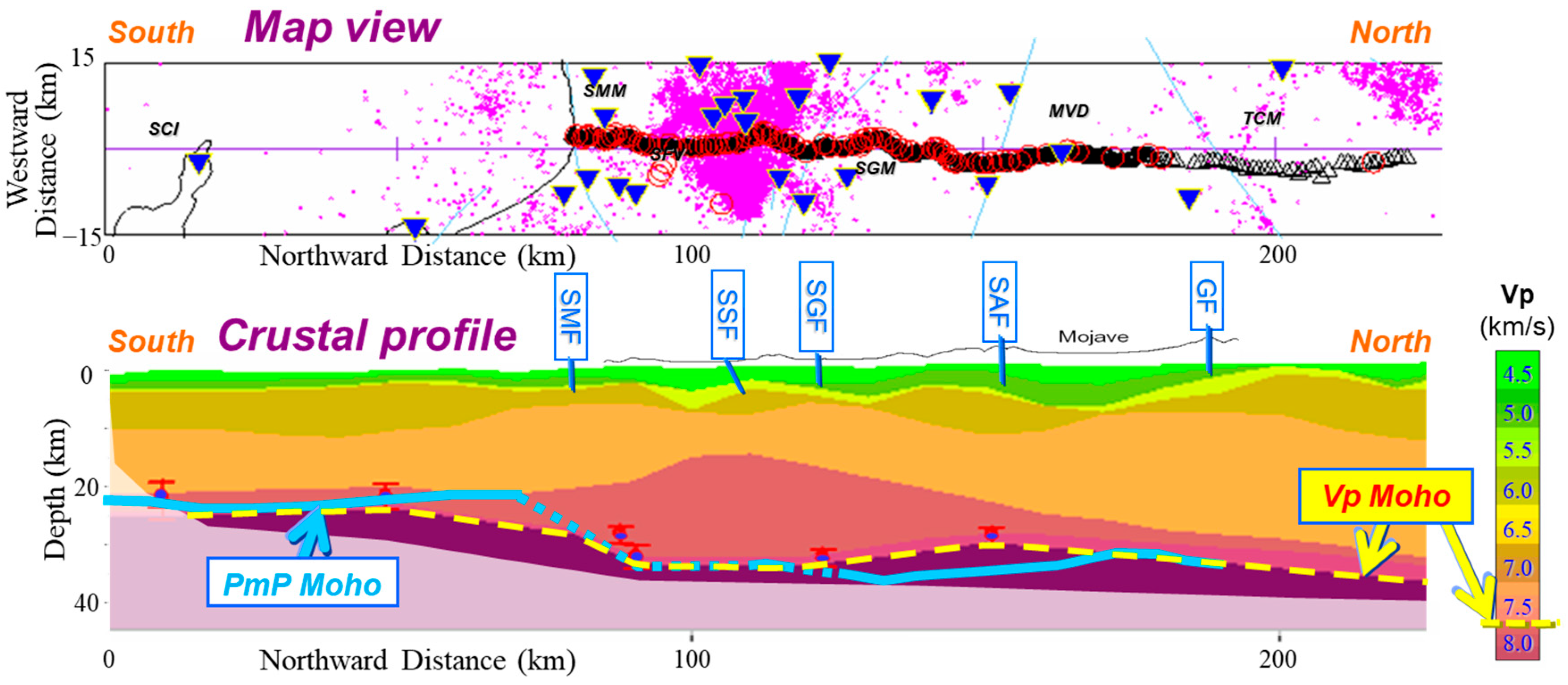 Figure 16. Map view and crustal profile for mapping the Moho discontinuity in Southern California via three different datasets and methods. (1) Vp Moho (dashed line in yellow color) from tomography velocities using earthquake data [48]. (2) PmP Moho (solid and dotted line in light blue color) based on reflection data [92]. (3) Moho depth ranges at six locations (bars in red color) based on receiver functions [91]. The map view shows the stations (blue triangles) and earthquakes (purple dots) used by [48], and shots (red circles) and stations (black triangles) provided the PmP data [92]. Names of faults: Santa Monica (SMF), Santa Susana (SSF), San Gabriel (SGF), San Andreas (SAF), and Garlock (GF).