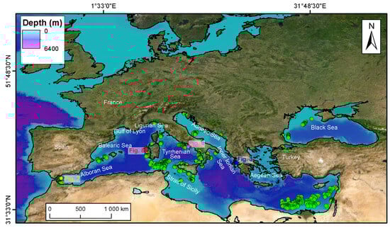In view of what was discussed above, this review is based on a dataset comprising more than 7500 examples of pockmarks located in various sectors of the Mediterranean Sea and surrounding basins (Table S1 in Supplementary Material). The dataset includes information on geographic distribution, bathymetry, proximity to geological faults, and sedimentary characteristics. The objectives of this study are: